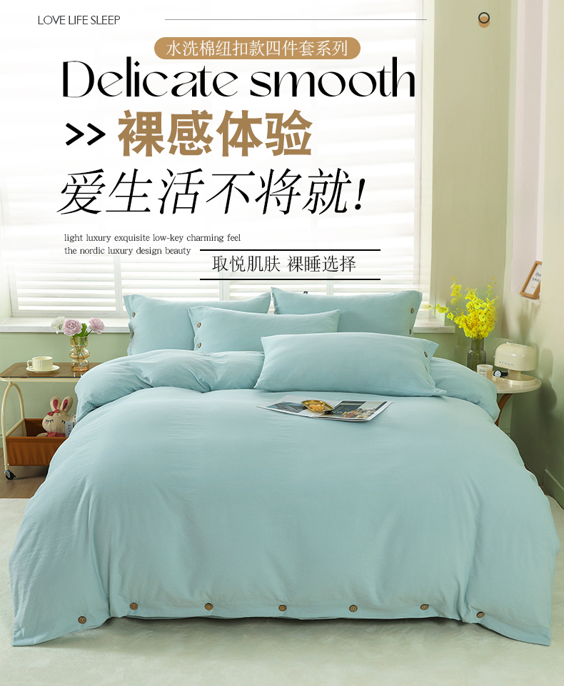 博婷 2026新款水洗棉麻皱皱纱纽扣工艺款四件套 湖蓝