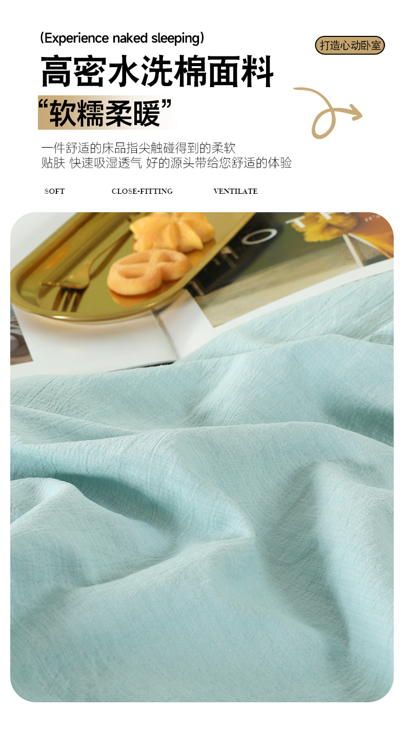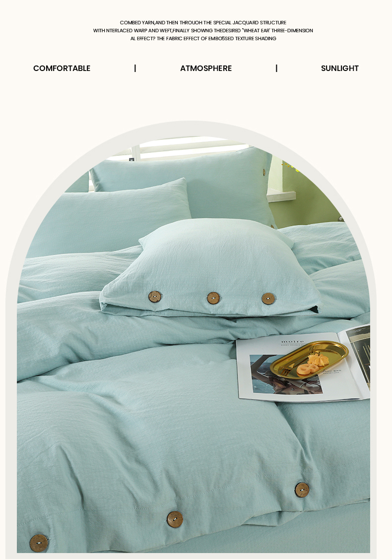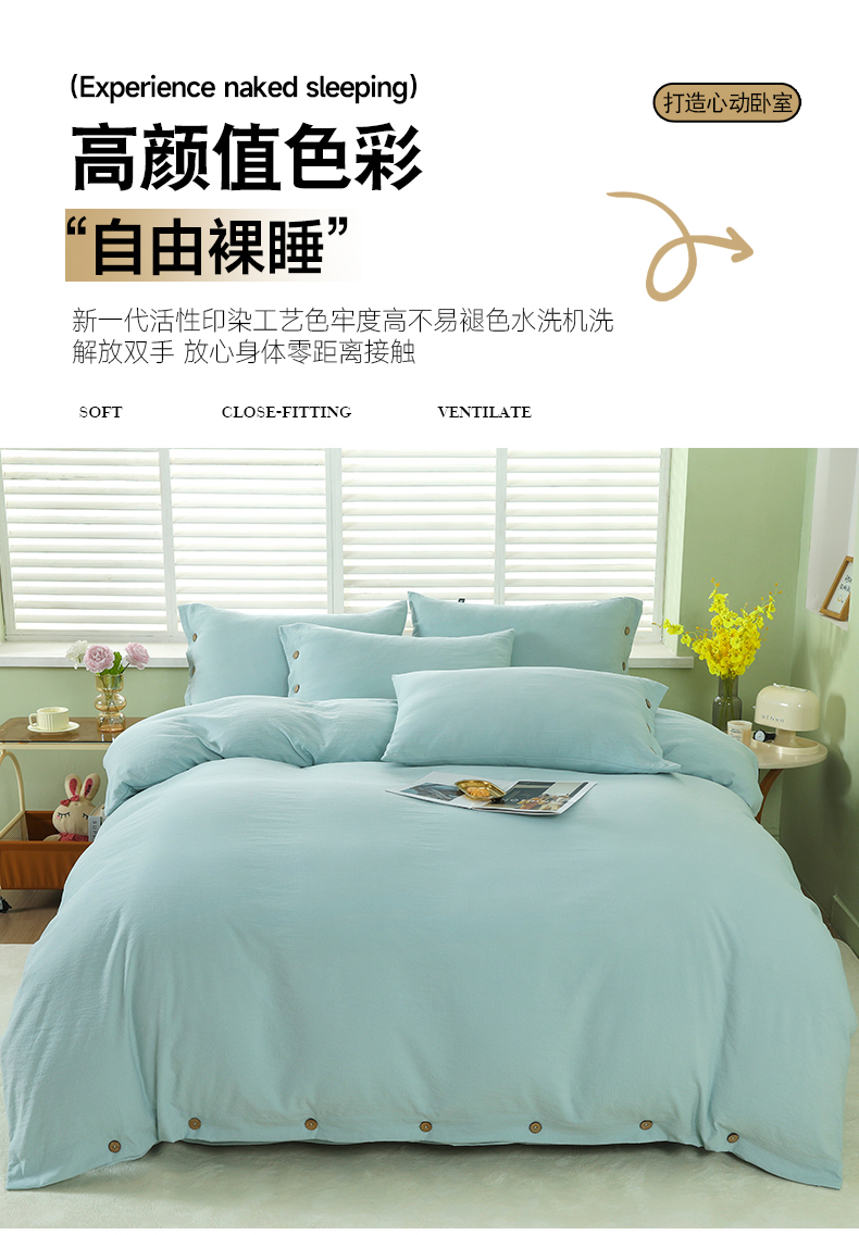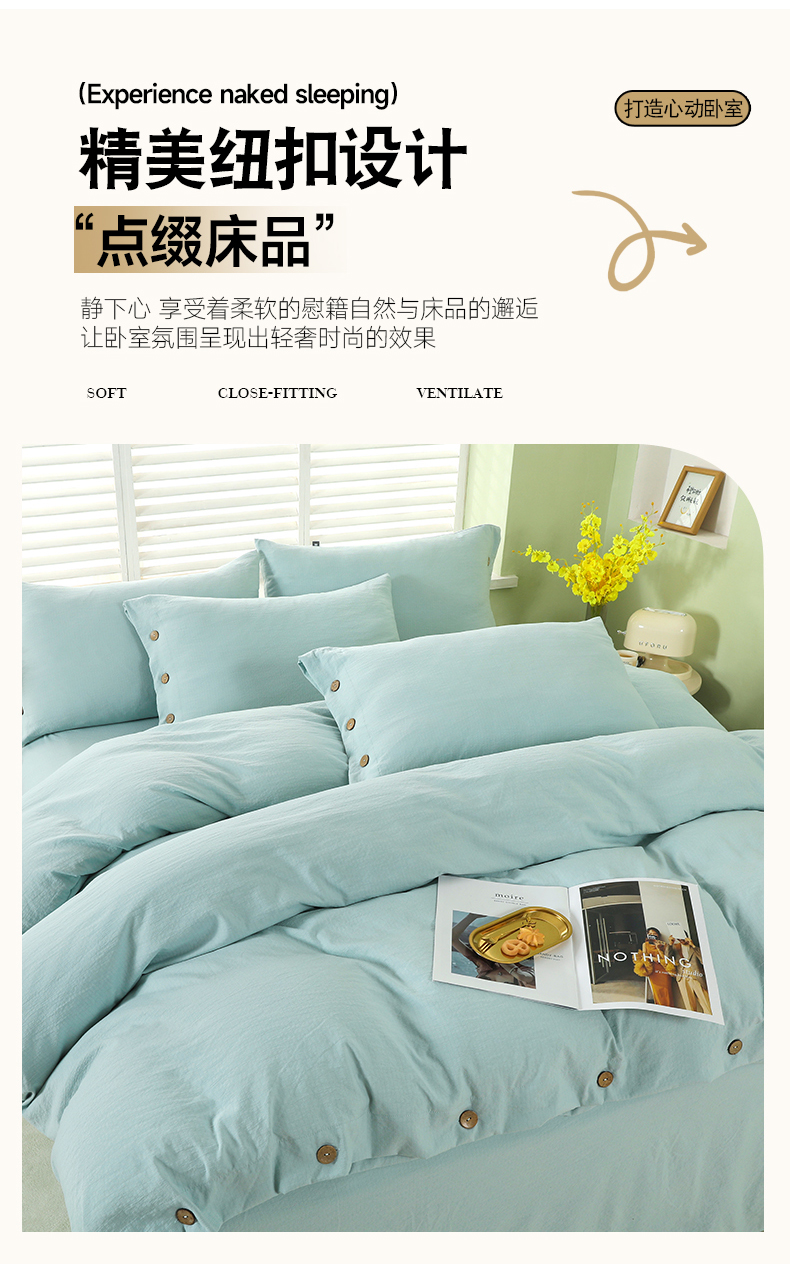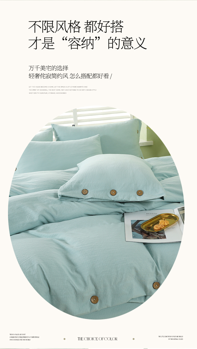 (总)博婷 2026新款水洗棉麻皱皱纱纽扣工艺款四件套,豆沙,湖蓝,灰色,姜黄,蓝色,浅咖