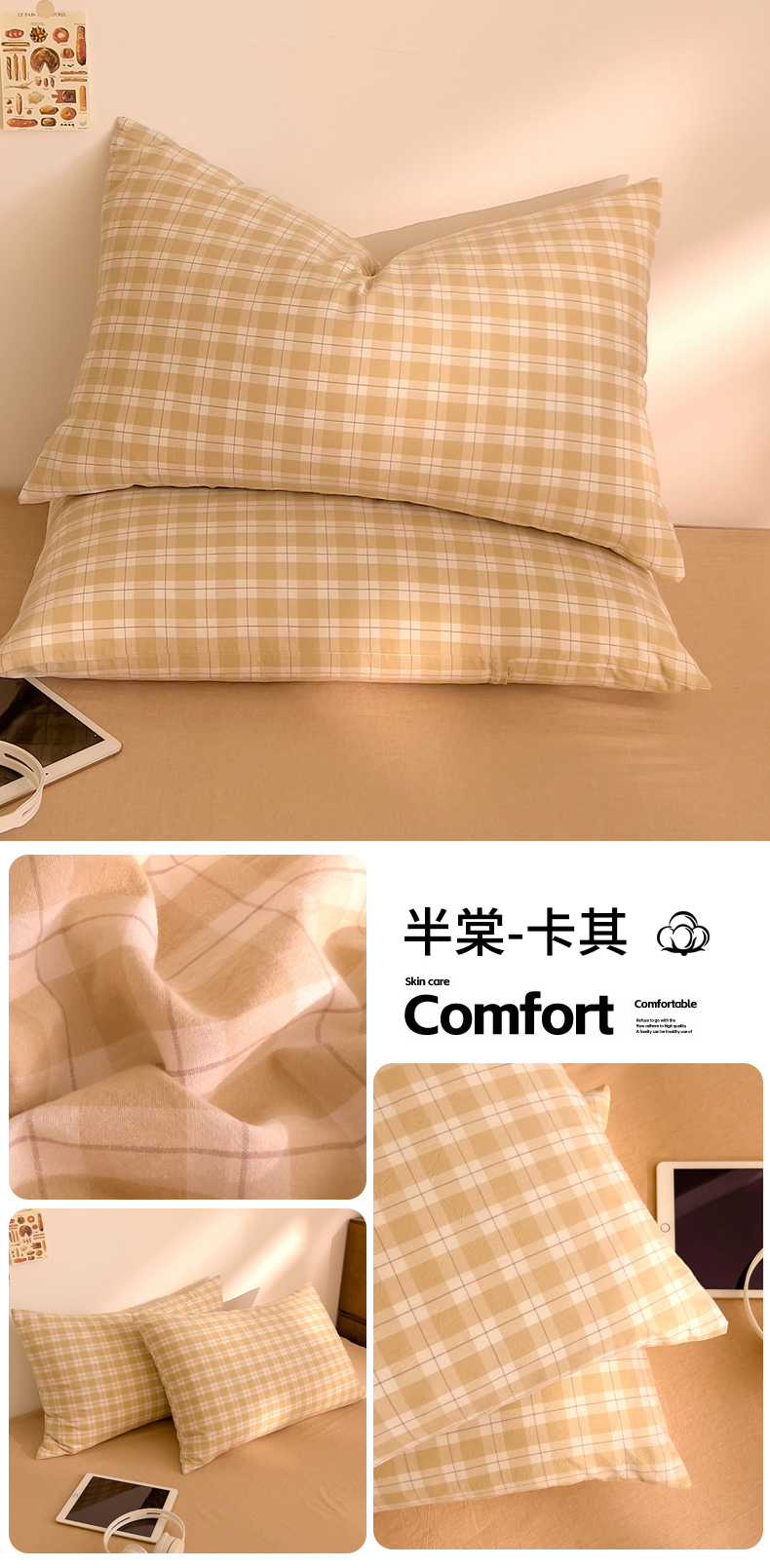 商品名称:DoDo 兜兜 2026新款全棉纯棉A类条格水洗棉单枕套枕套单件-可定做尺寸 半棠-卡其