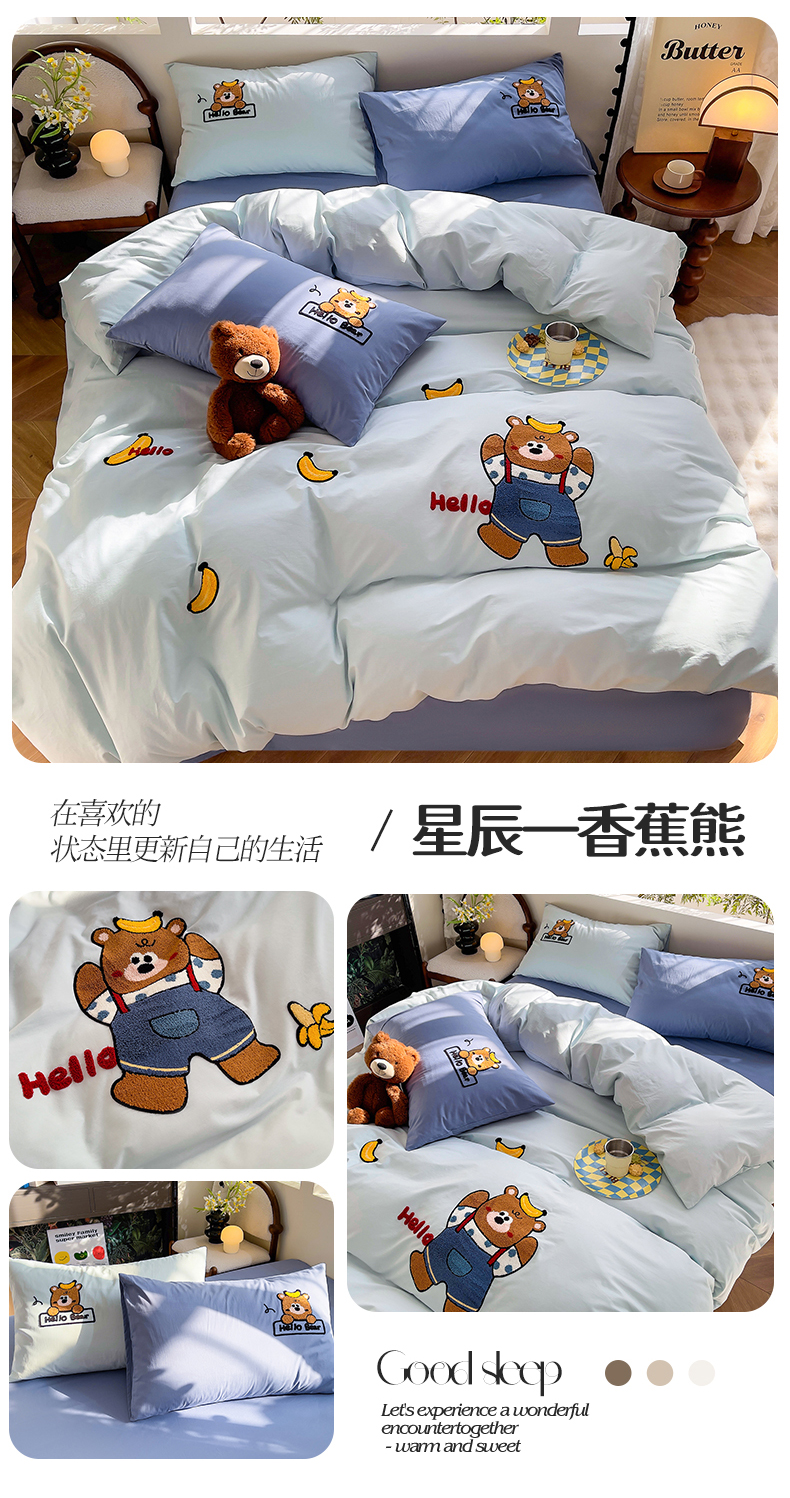 (总)炫拼家纺 2026新款A类棉麻刺绣卡通贝壳边四件套-布鲁系列,布鲁-小猫,布鲁-小熊,布鲁-小狗,布鲁-小马