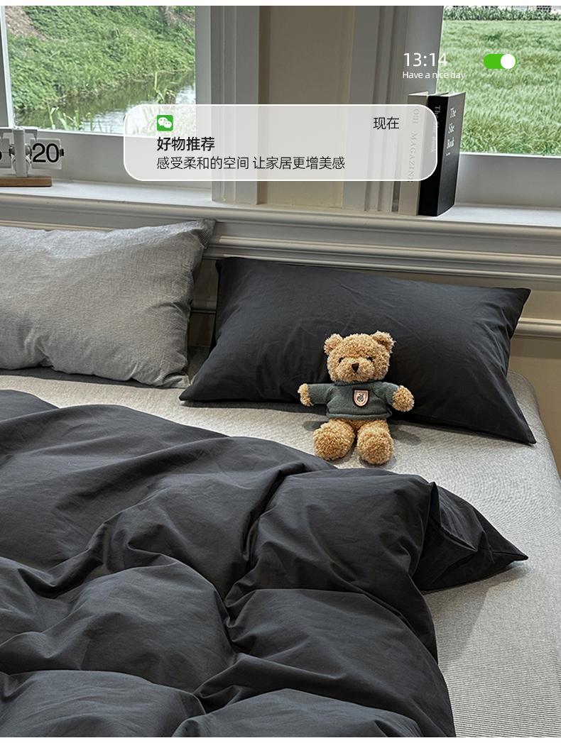(总)欣晴家纺 2025新款软糯糯亲肤水洗棉条纹格子三件套四件套,海盐纹,风织线,复古格,灰序曲,旧时光,木年轮,奶霜条,云糖纹,云影格