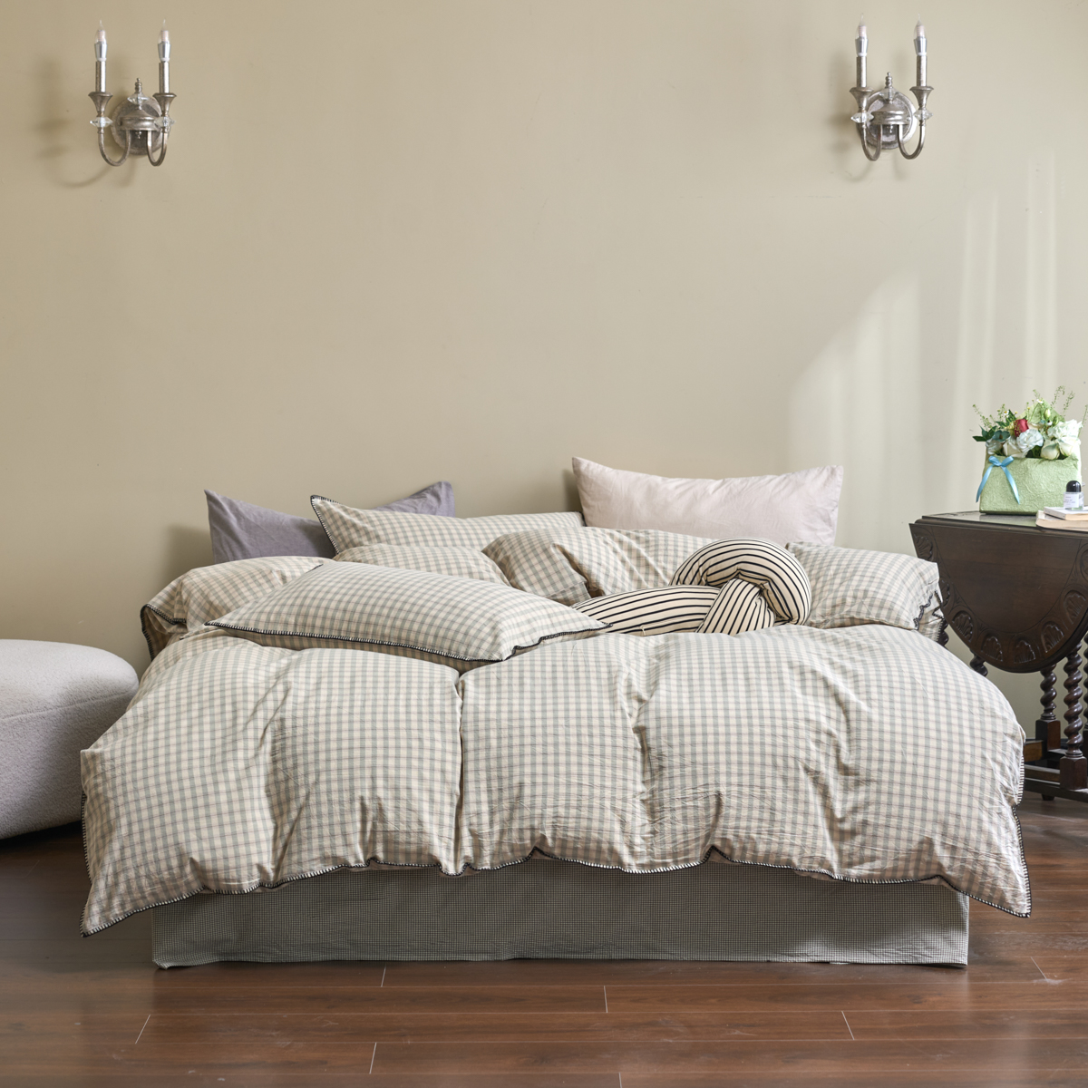 (总)洋铭区(原狠狠爱) 2026新款色织水洗棉一字边四件套系列,朵拉粉格,朵拉咖格,朵拉绿格,翡翠绿格,风雅蓝格,枫叶红格,红茶格,山宇灰格,杏仁米格,烟幕黑格,烟幕蓝格,烟幕棕格,组合