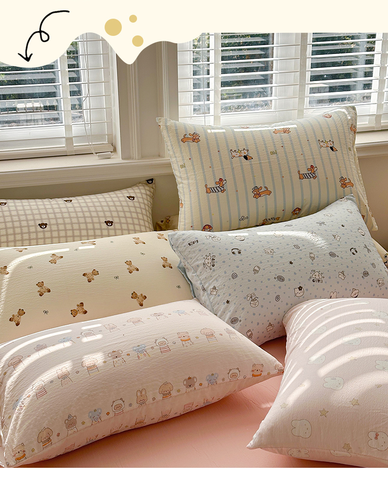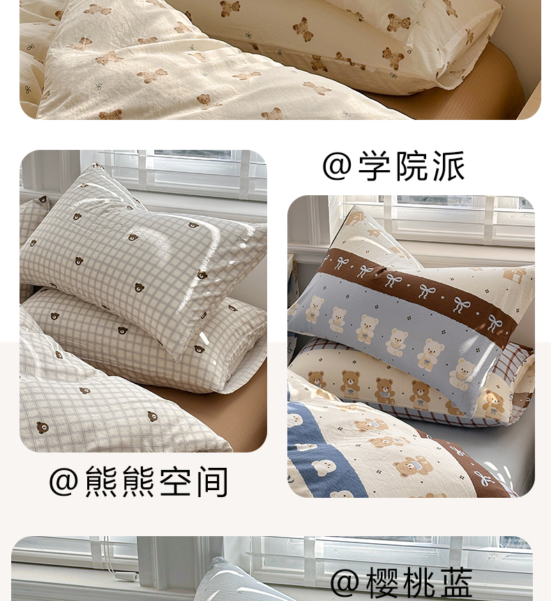(总)多品家纺 2026新款奶呼呼超柔云感双层纱系列单枕套,白露,半岛兰格,半岛紫格,豹纹猫咪,粉粉小花,福气满满,花田小狗,欢乐时光,开心狗,棉花兔兔,浅浅春意,桃气兔兔,淘气园,汪星人,小橘狗,熊多多,熊熊空间,学院派,樱桃蓝,樱桃紫,组合图