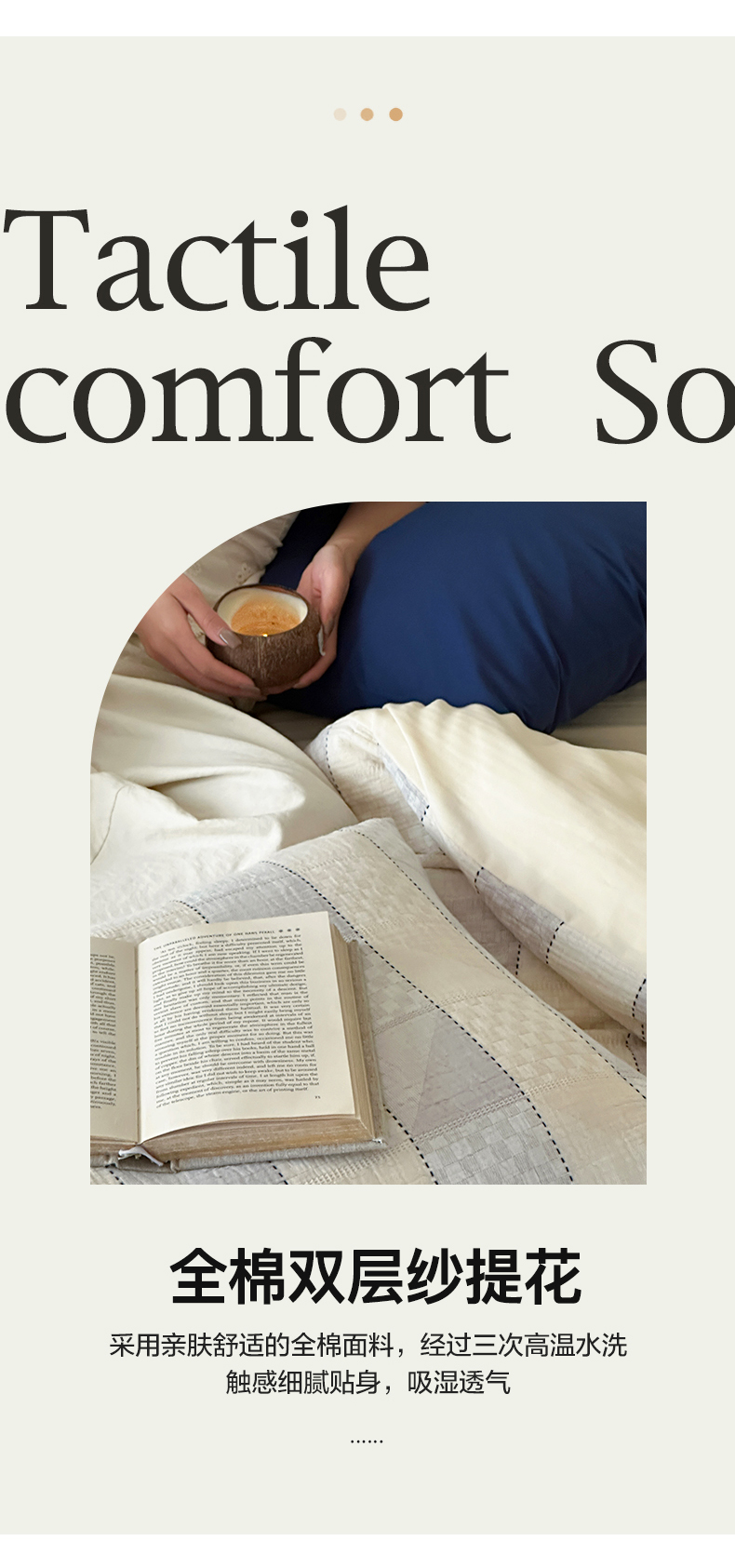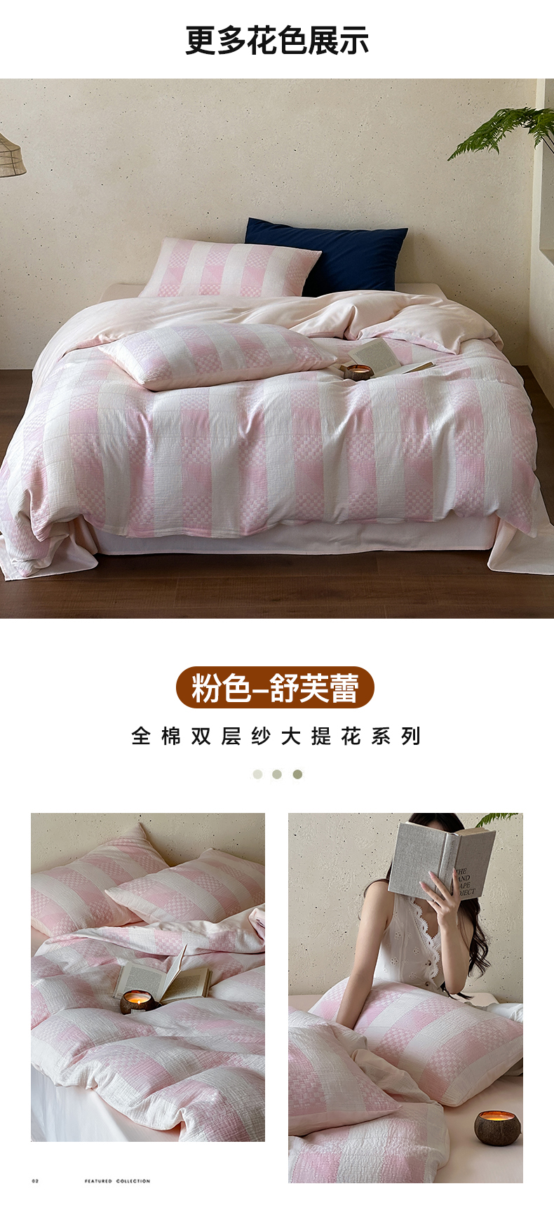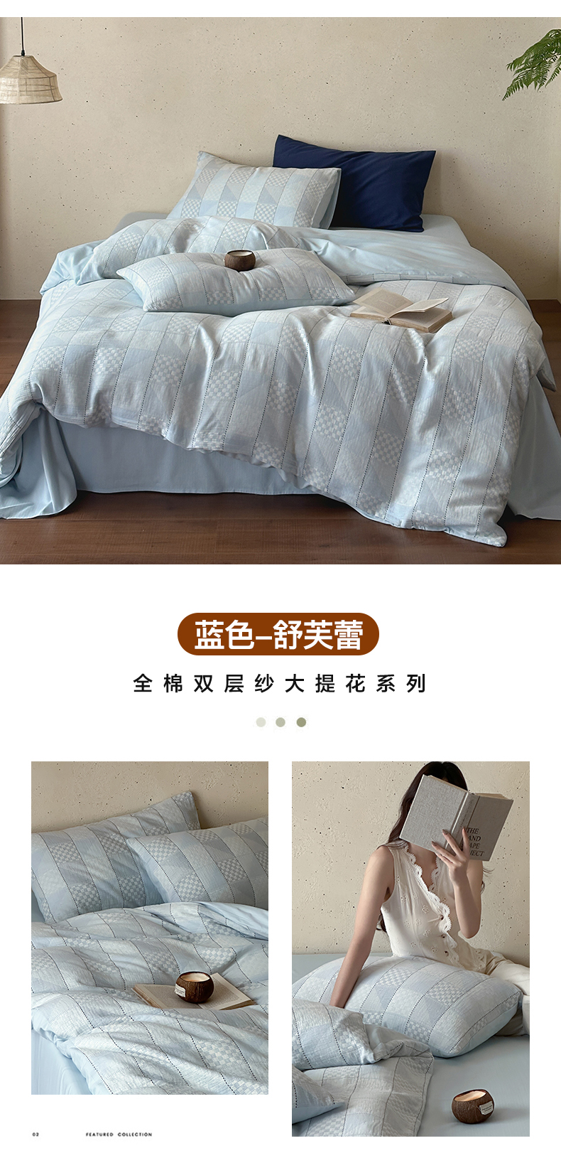 当前位置: 91家纺网 > 商品网购 > 床品套件 > 四件套 > 全棉普通四件套 > 例外 2026新款全棉纯棉双层纱布大提花四件套舒芙蕾 蓝色-舒芙蕾