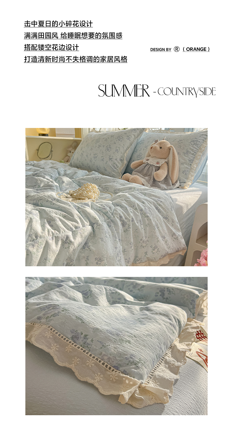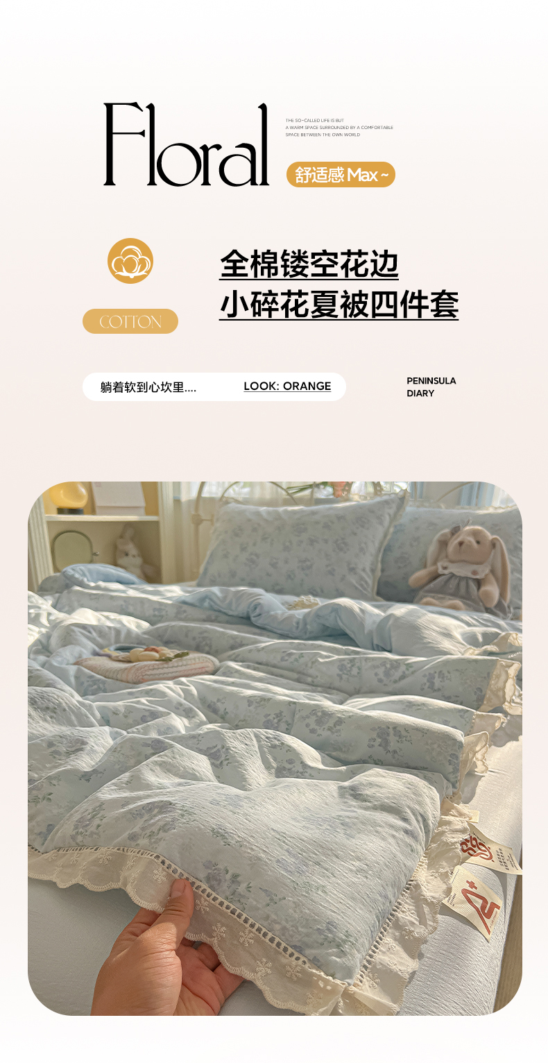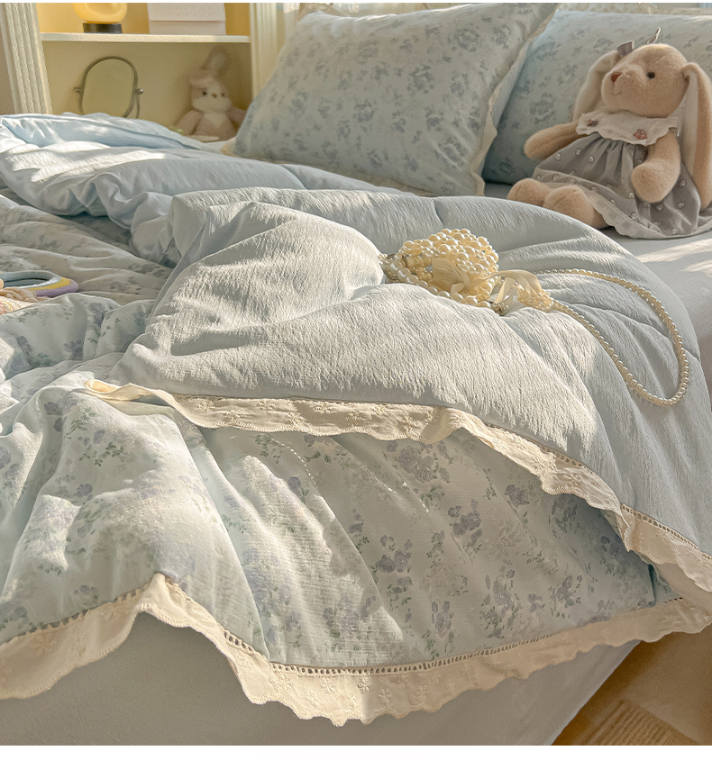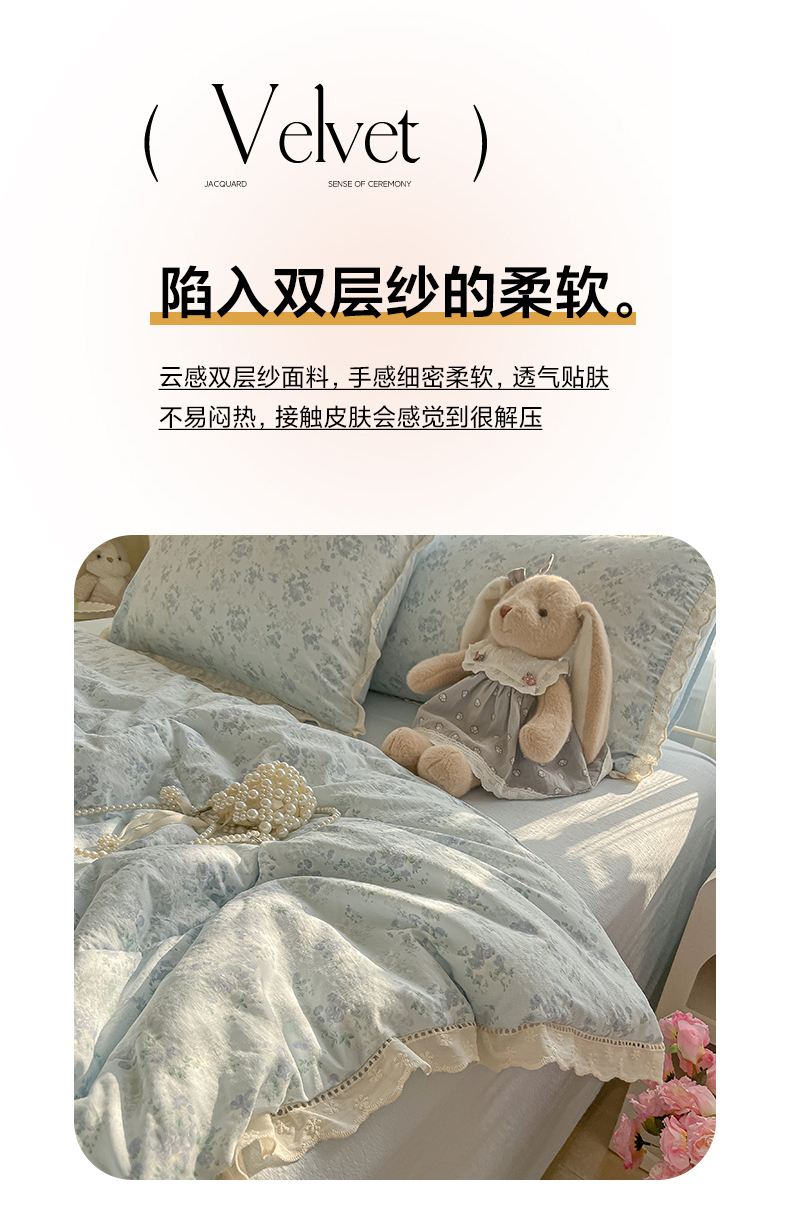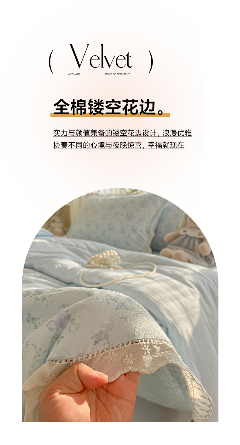 商品名称:罗亿家纺 2026新款全棉镂空花边云感双层纱夏被四件套 蓝萱