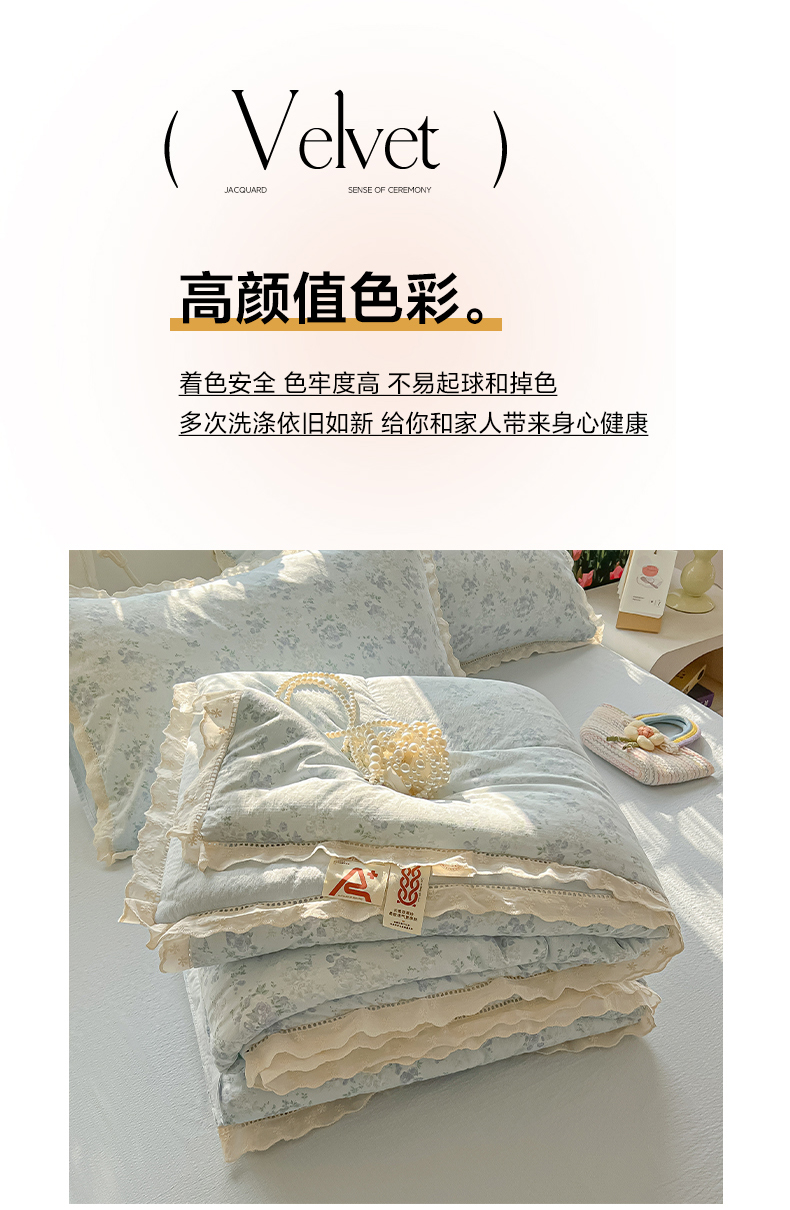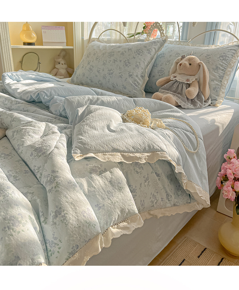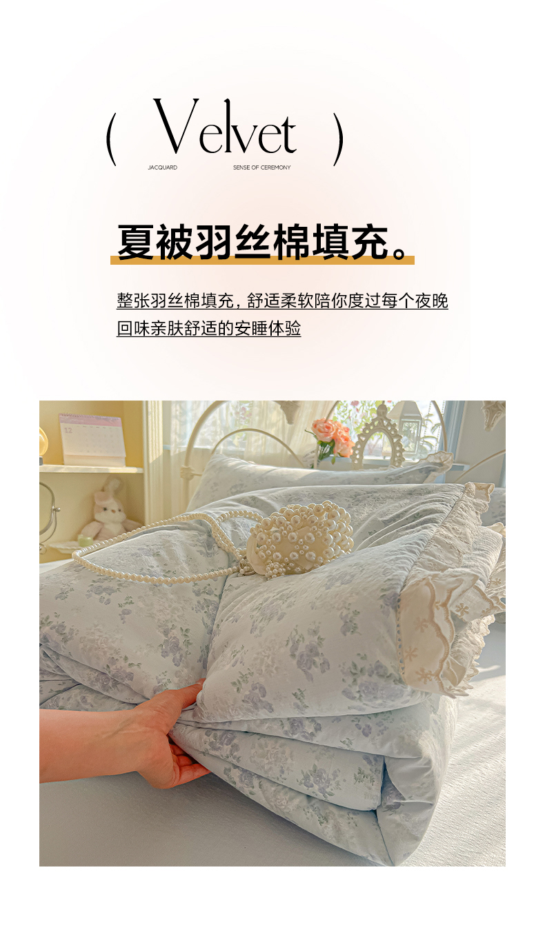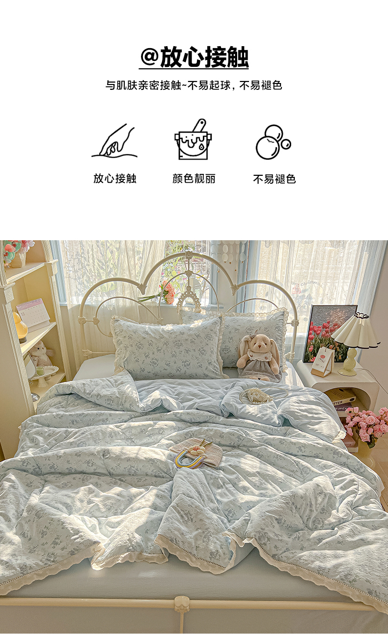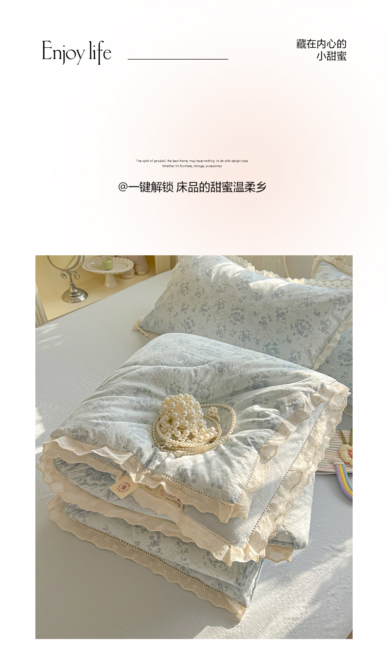 商品名称:罗亿家纺 2026新款全棉镂空花边云感双层纱夏被四件套 蓝萱