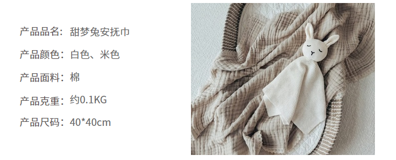 当前位置: 91家纺网 > 商品网购 > 居家日用 > 其他分类 > 暖绵绵家纺 新款宝宝的好玩伴萌兔安抚巾新生儿陪睡软玩偶-甜梦兔 甜梦兔-米色 40*40cm