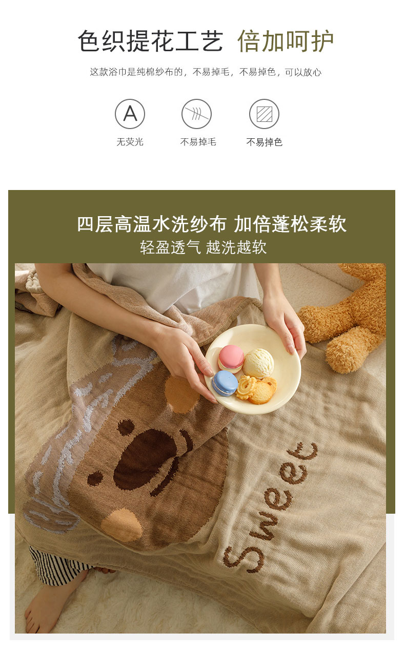 当前位置: 91家纺网 > 商品网购 > 毛毯休闲毯绒毯 > 毛毯 > 沐珩家纺 2026新款全棉纯棉四层纱布浴巾沙发巾加大尺寸多功能毛巾毯 熊宝