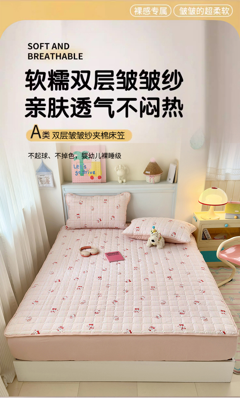 • 91家纺网 家纺一手货源 找家纺 丽美人家纺 2026新款双层皱皱纱大豆夹棉床笠单床笠床笠单件 JM粉格猫咪