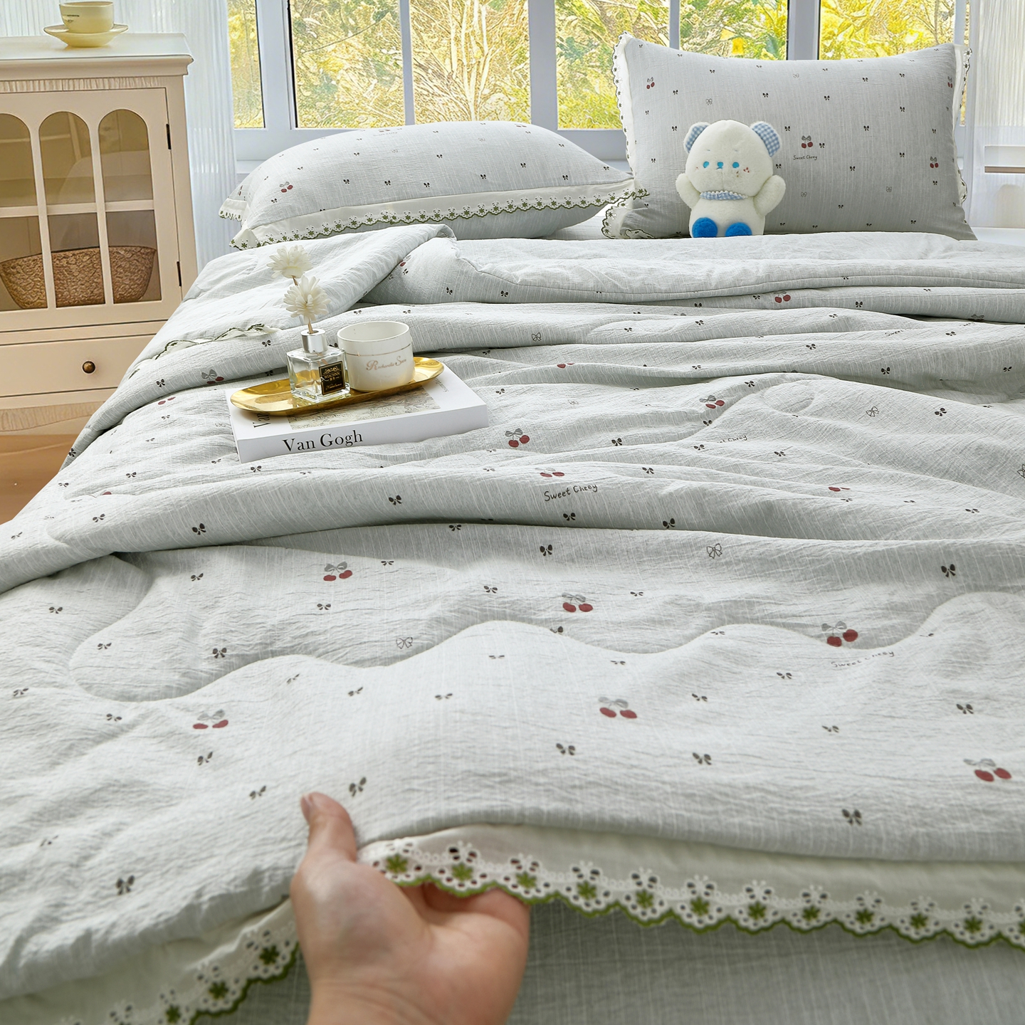 (总)恋之语 2026新款爆款花边色织水洗棉夏被夏凉被空调被四件套,波点奶汪,草莓,草莓气泡,草莓甜酒,春日花蔓,粉色领结,粉雾小花,灰调条纹,灰枝漫舞,灰枝疏影,墨蝶轻舞,浅蓝萌宠,浅蓝旺旺,浅棕蝶舞,浅棕汪汪,樱桃,樱桃-蓝,紫雾繁花
