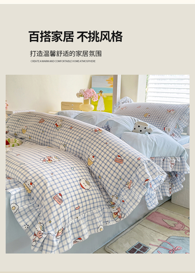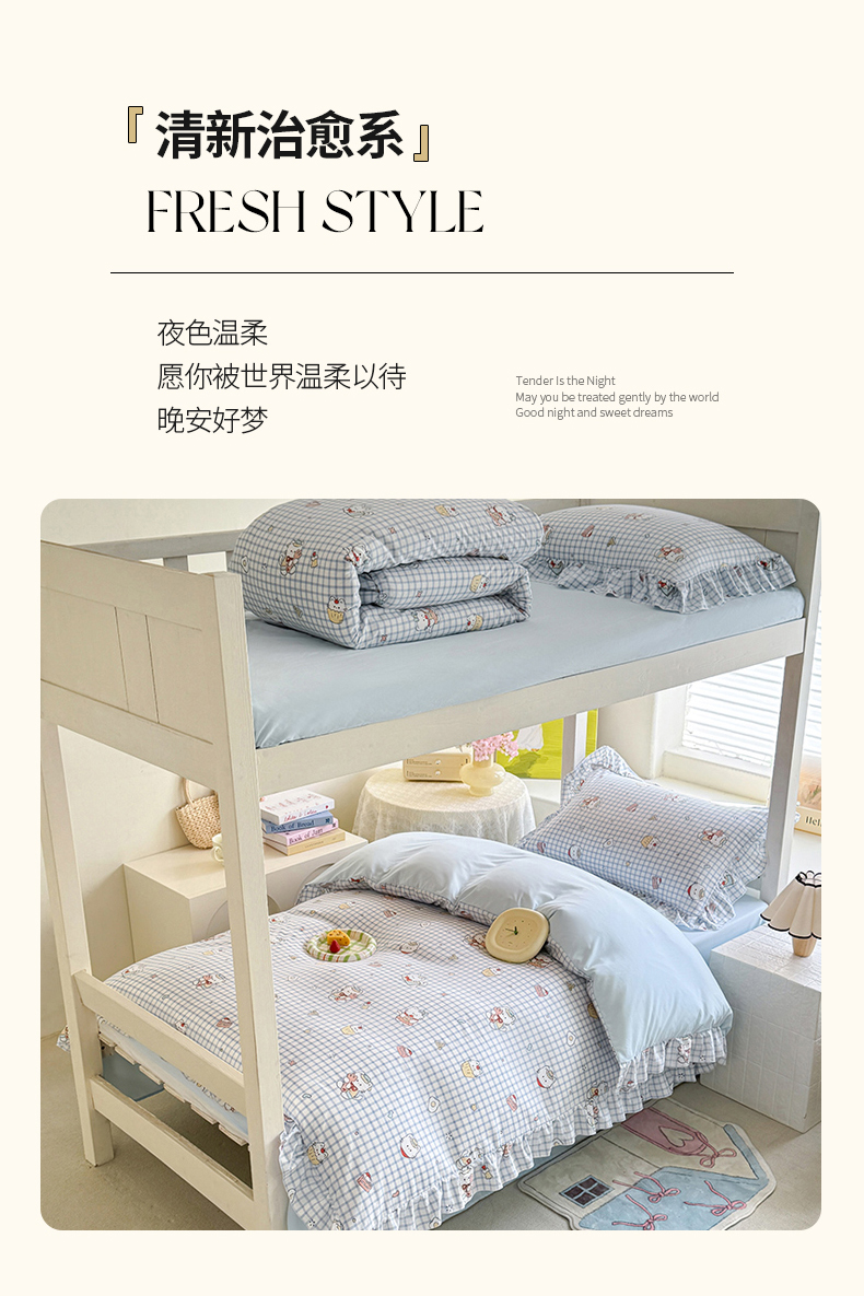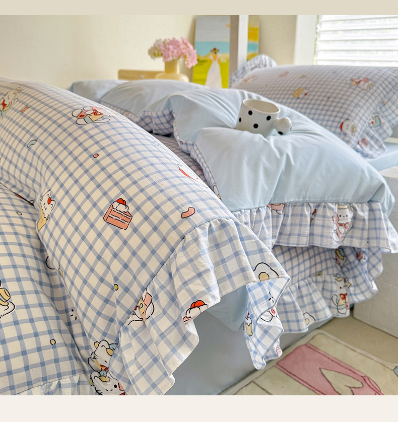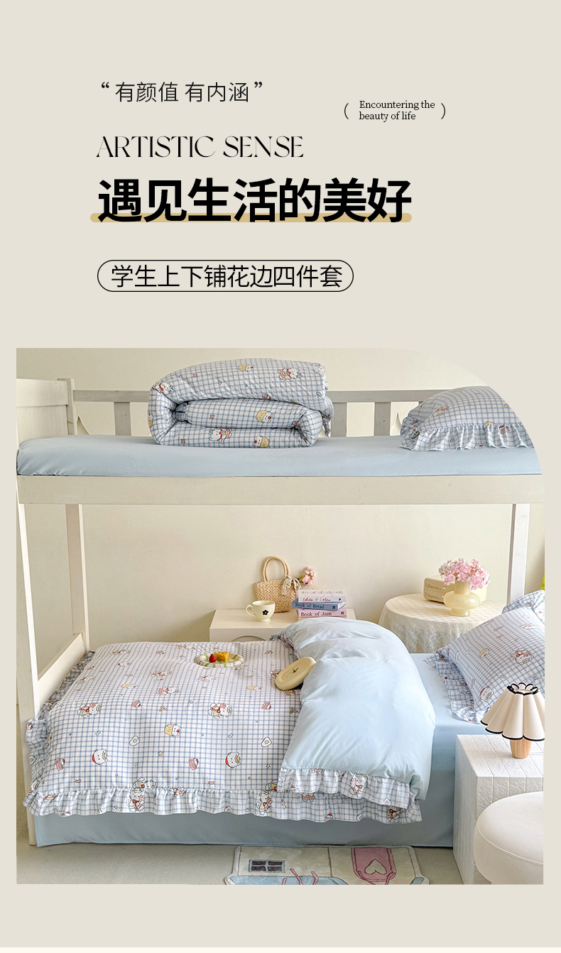 当前位置: 91家纺网 > 商品网购 > 床品套件 > 四件套 > 水洗棉四件套 > 经年 2026新款学生季上下铺韩版花边水洗云朵棉学生宿舍三件套四件套 蓝格小猫