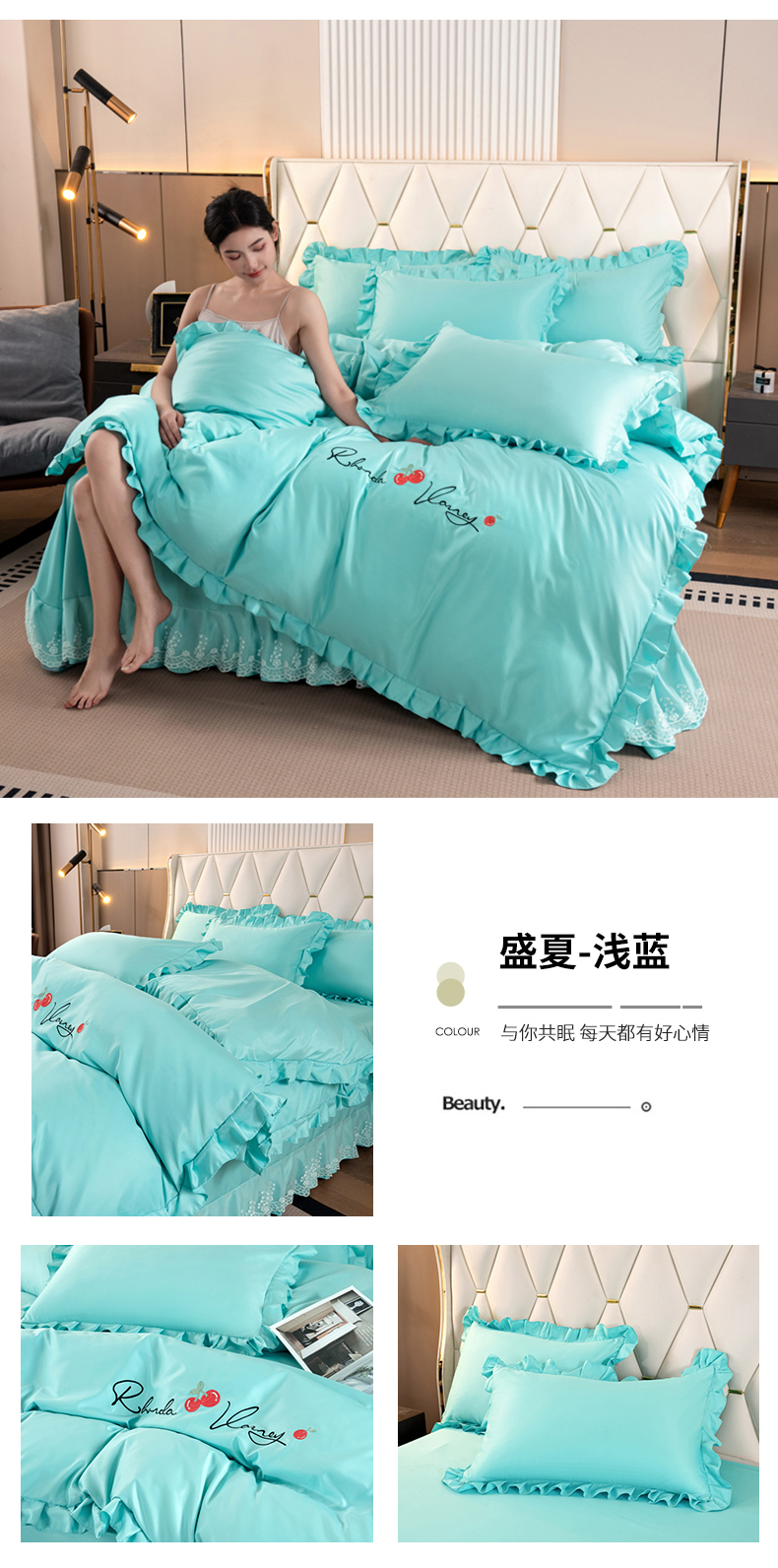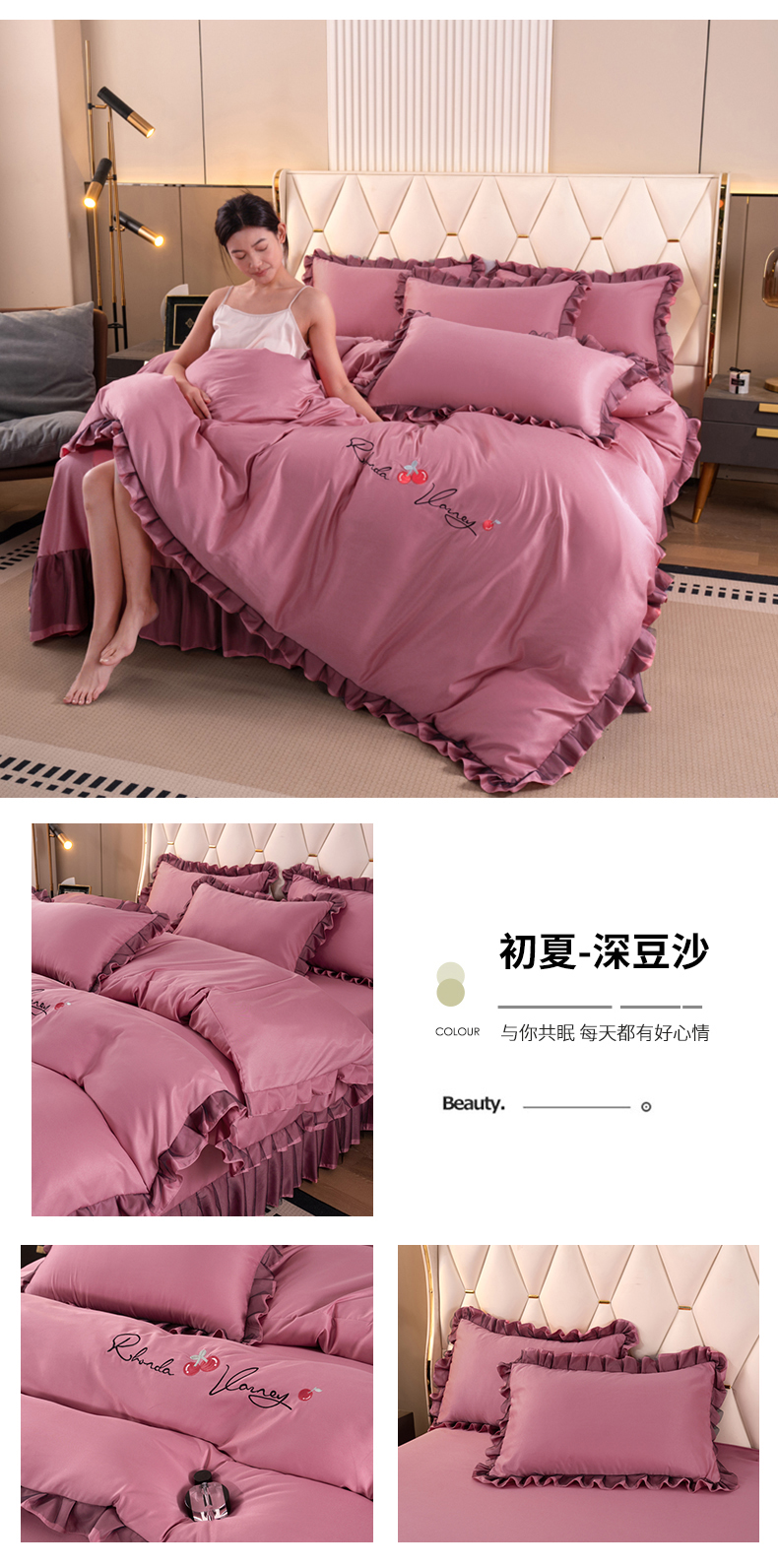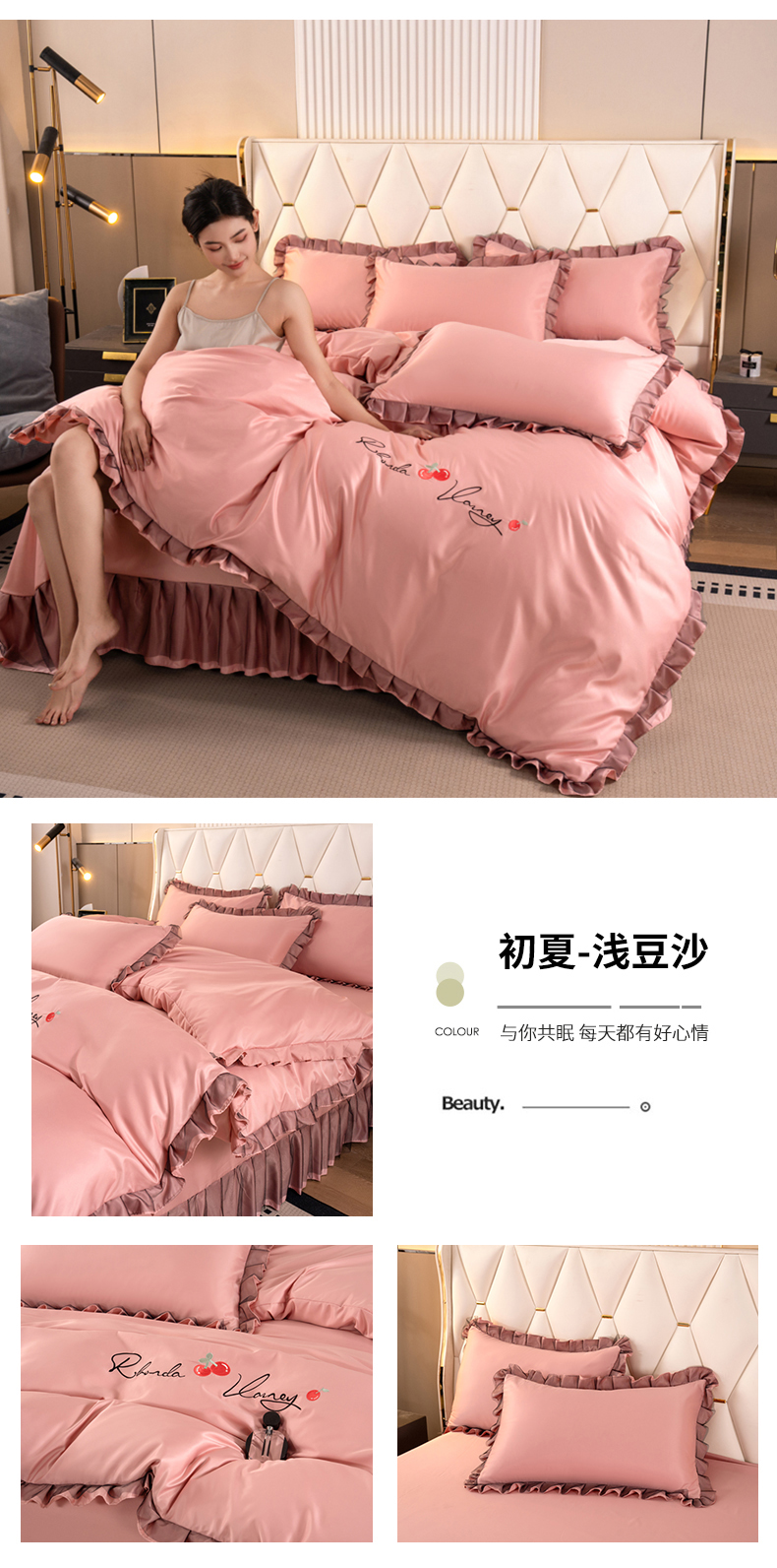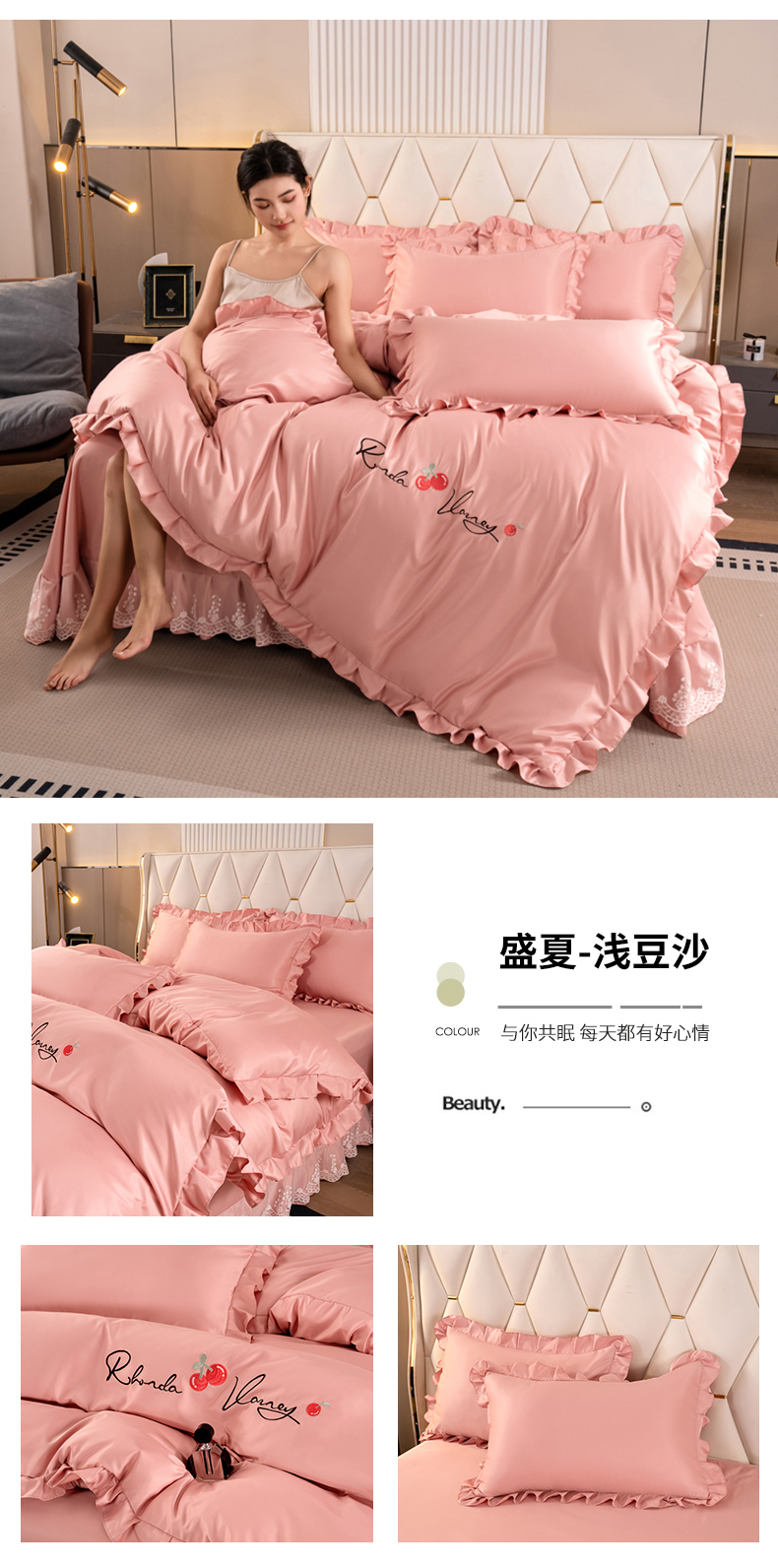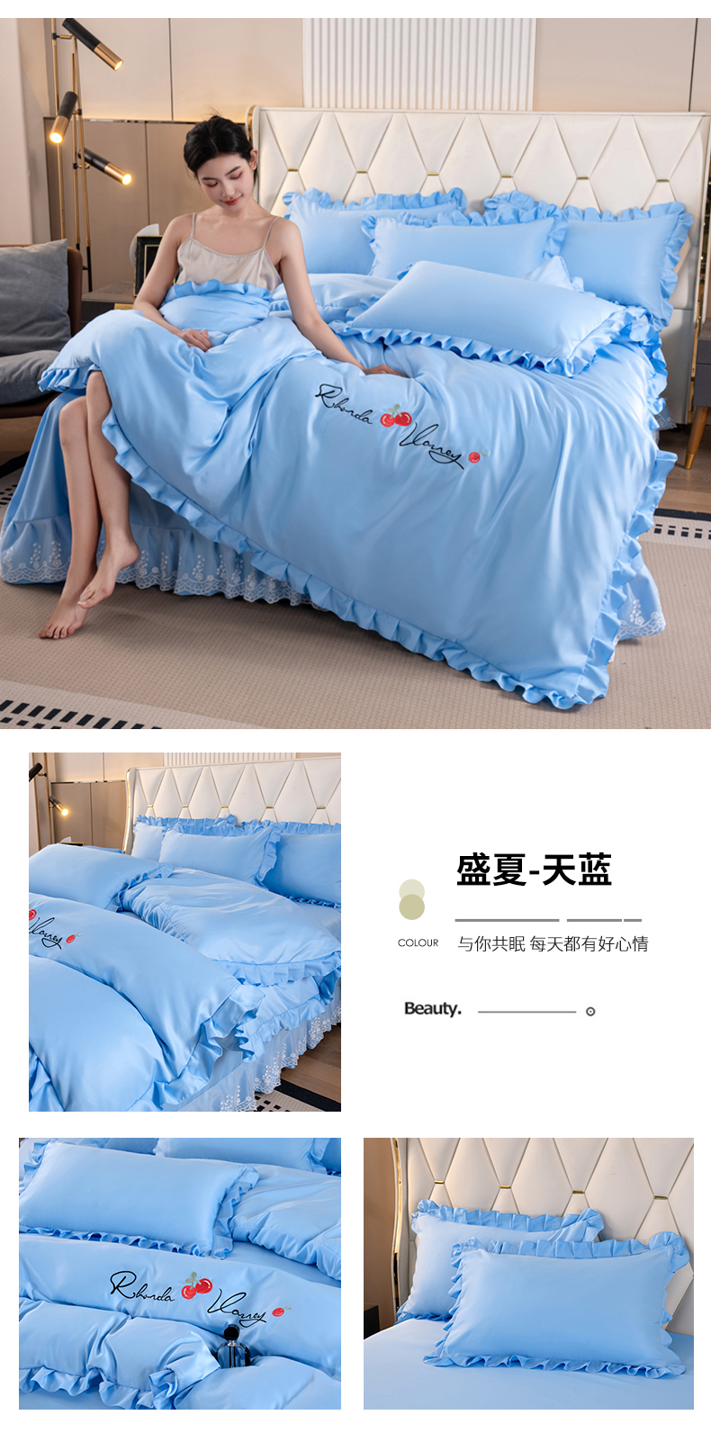 (总)畅畅家纺 2026新款春夏高档轻奢韩版提花花边床盖四件套水洗真丝冰丝套件,花边-粉色,花边-米白色,花边-蓝色,花边-浅玉