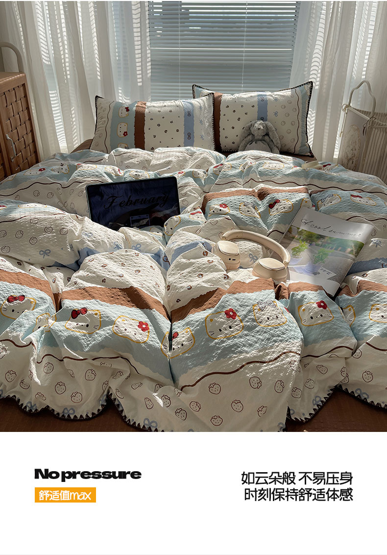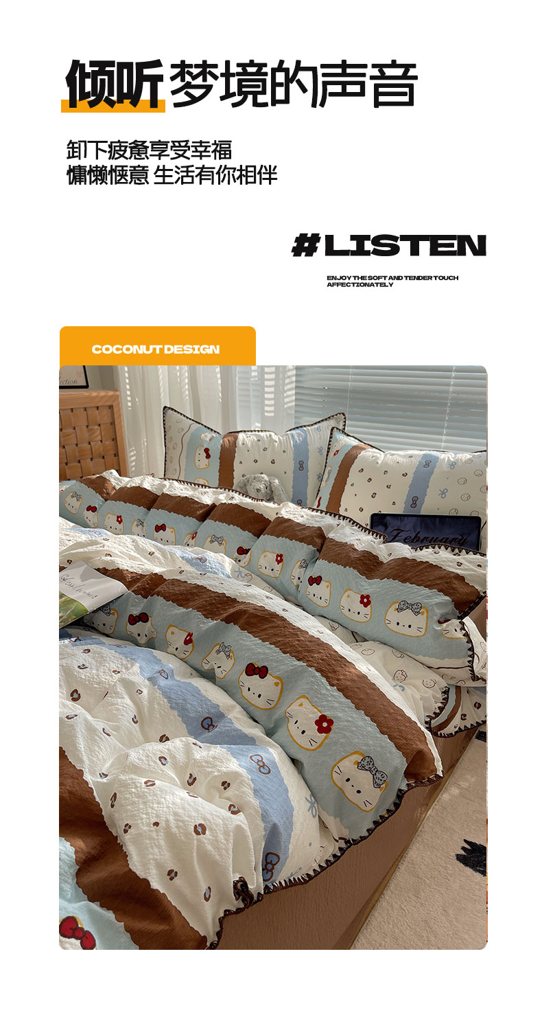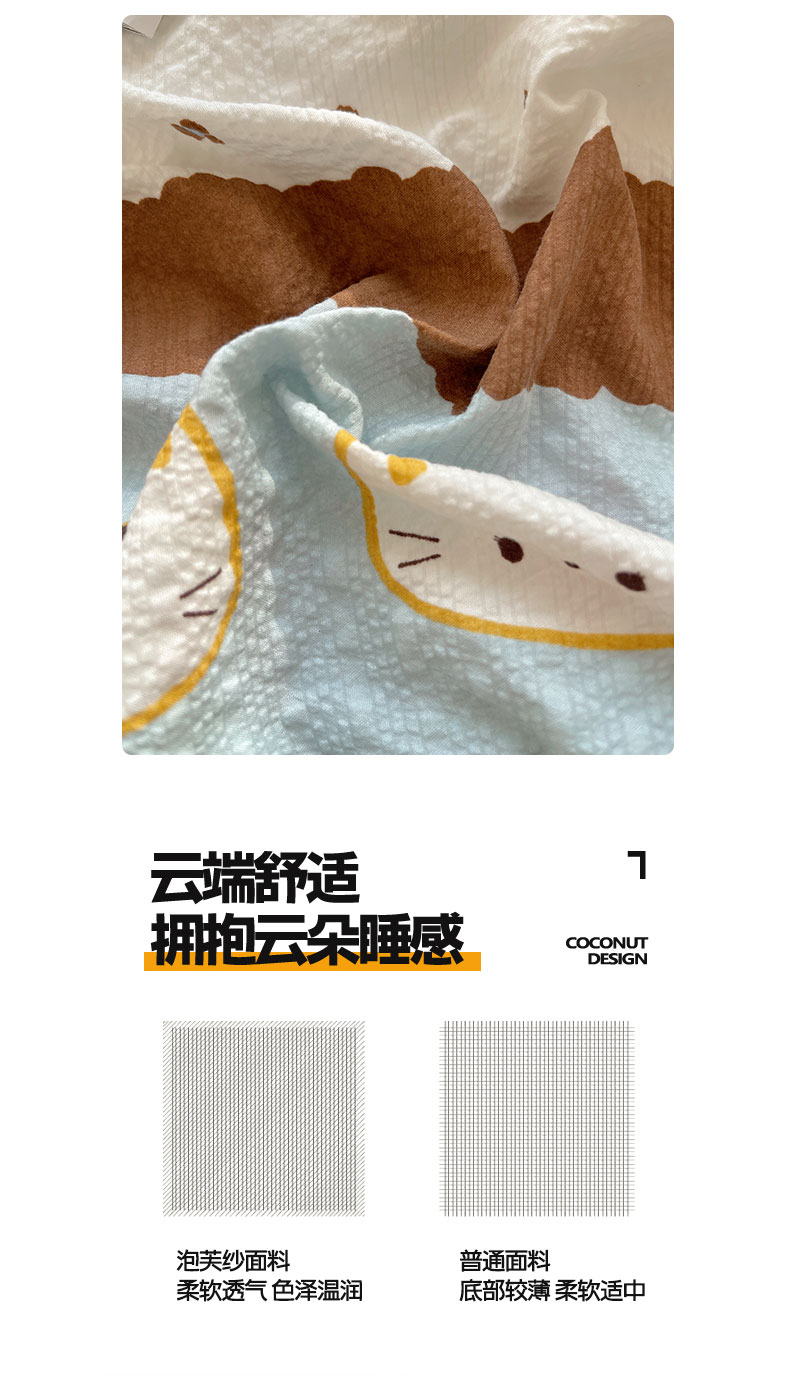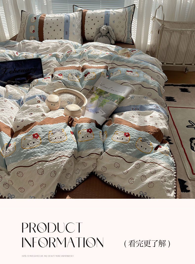 当前位置: 91家纺网 > 商品网购 > 床品套件 > 四件套 > 其它四件套 > 桃心家居 2026新款A类费尔岛可爱卡通贝壳边三角针工艺双层纱泡芙棉泡芙纱系列四件套 泡芙棉-海盐布丁猫