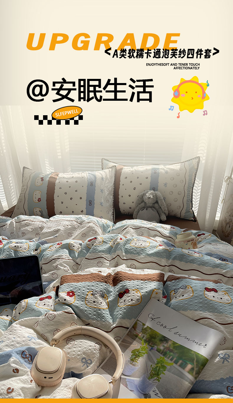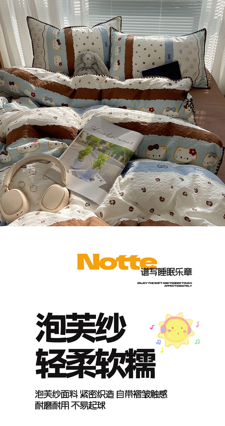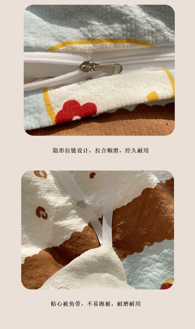 当前位置: 91家纺网 > 商品网购 > 床品套件 > 四件套 > 其它四件套 > 桃心家居 2026新款A类费尔岛可爱卡通贝壳边三角针工艺双层纱泡芙棉泡芙纱系列四件套 泡芙棉-海盐布丁猫