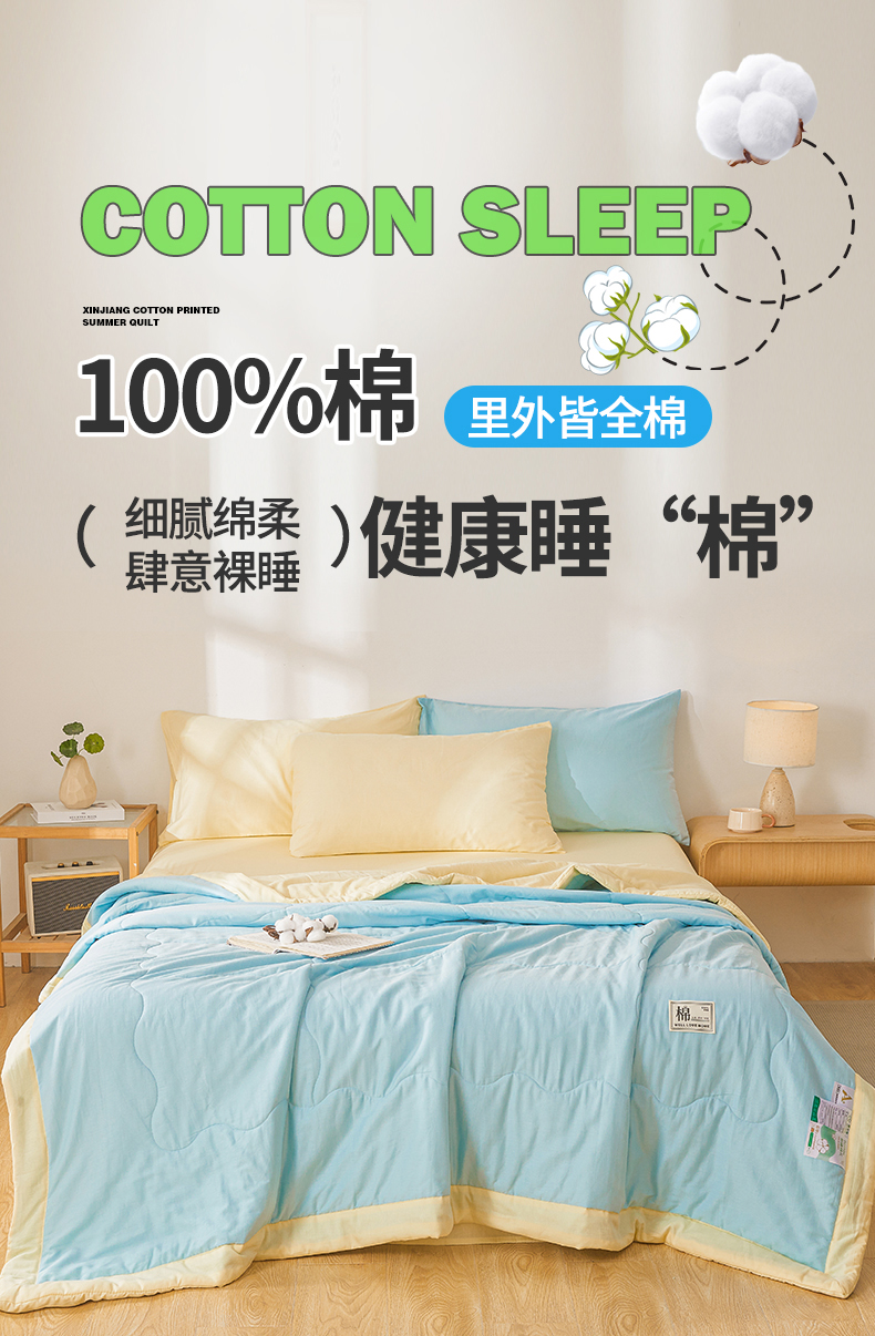 • 91家纺网 家纺一手货源 找家纺 晓时候 2026新款纯色100%里外全棉新疆棉花被纯棉夏凉被空调被夏被四件套被子被芯 里外全棉-天空蓝拼黄