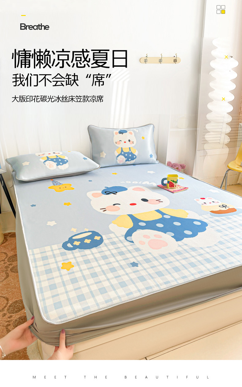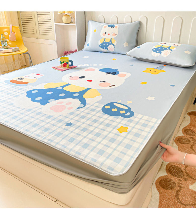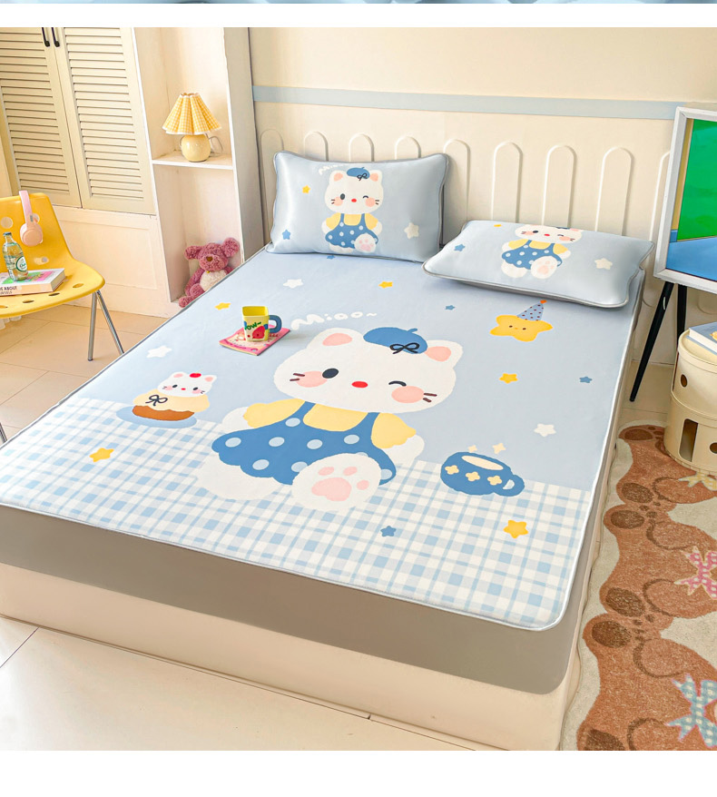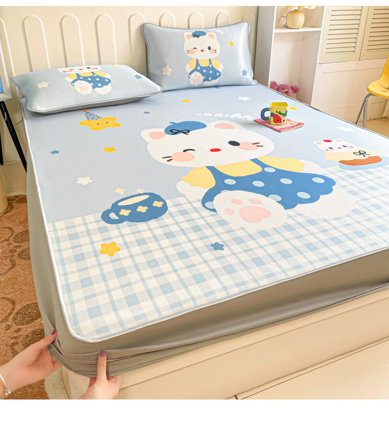 商品名称:柒月家居 2026新款大版印花碳光冰丝席床笠款凉席 床笠-茶茶蓝猫