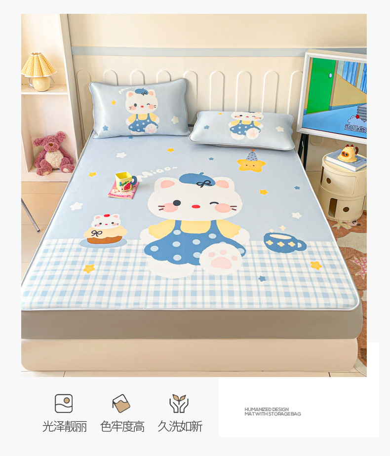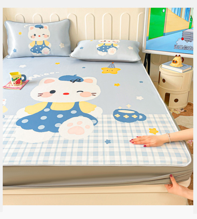 柒月家居 2026新款大版印花碳光冰丝席床笠款凉席 床笠-茶茶蓝猫