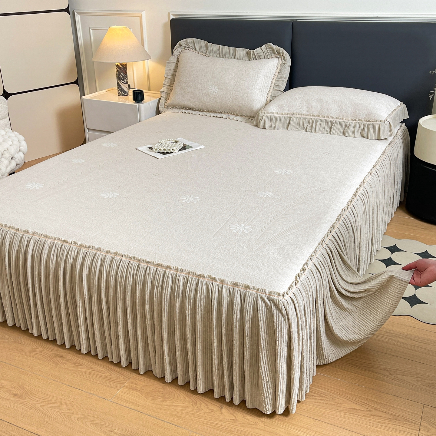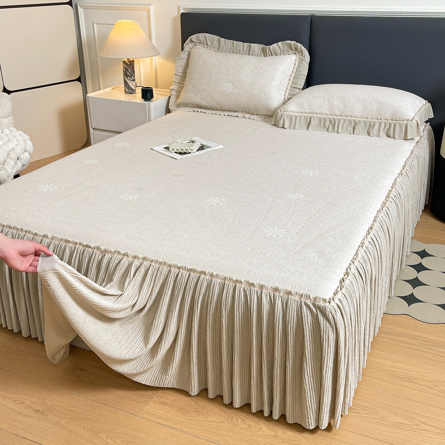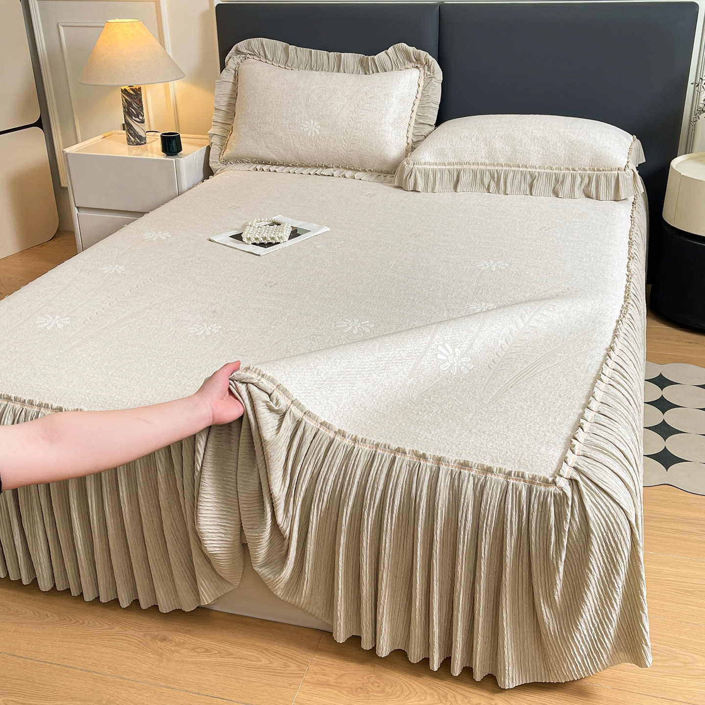 当前位置: 91家纺网 > 商品网购 > 床上用品 > 凉席 > 凉席套件 > 牵梦萦家纺 2026新款立体浮雕压花工艺凉感豆豆凉席-床裙款 彩蝶-香槟
