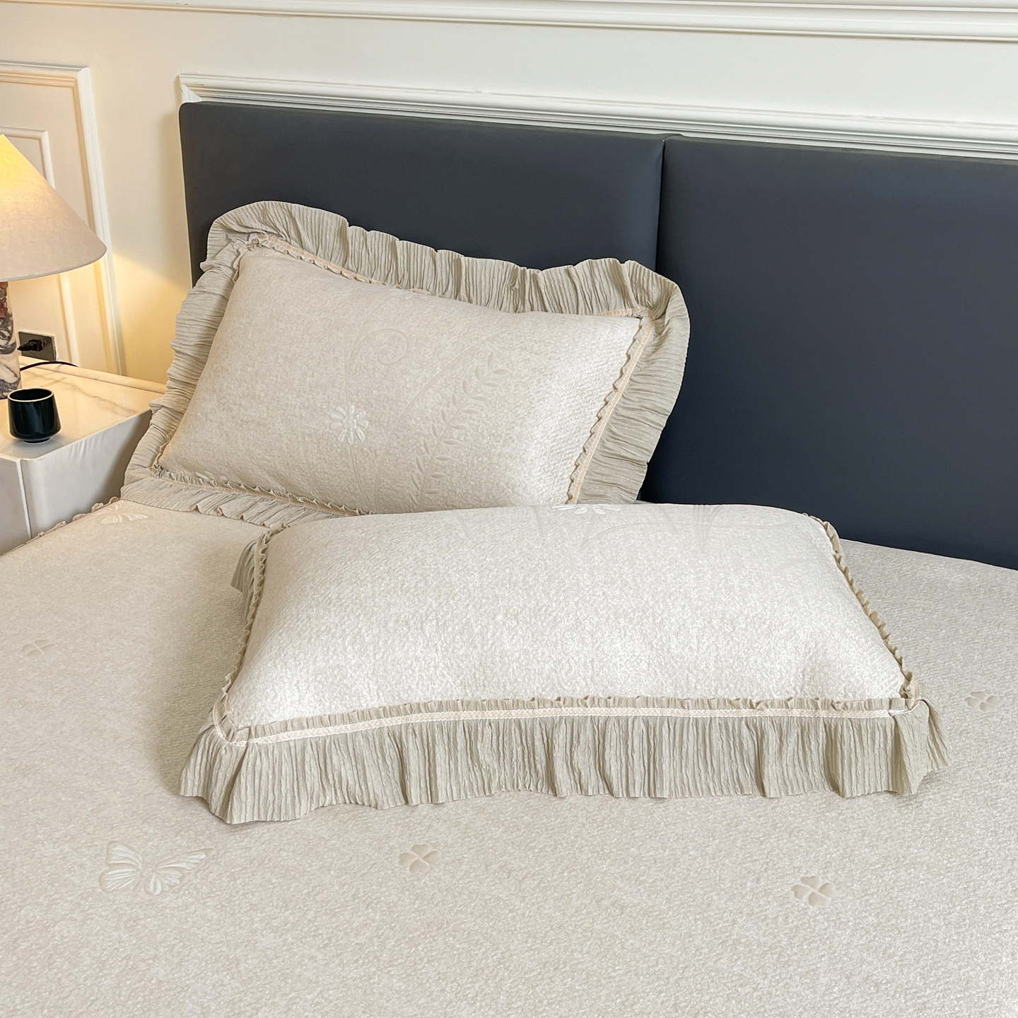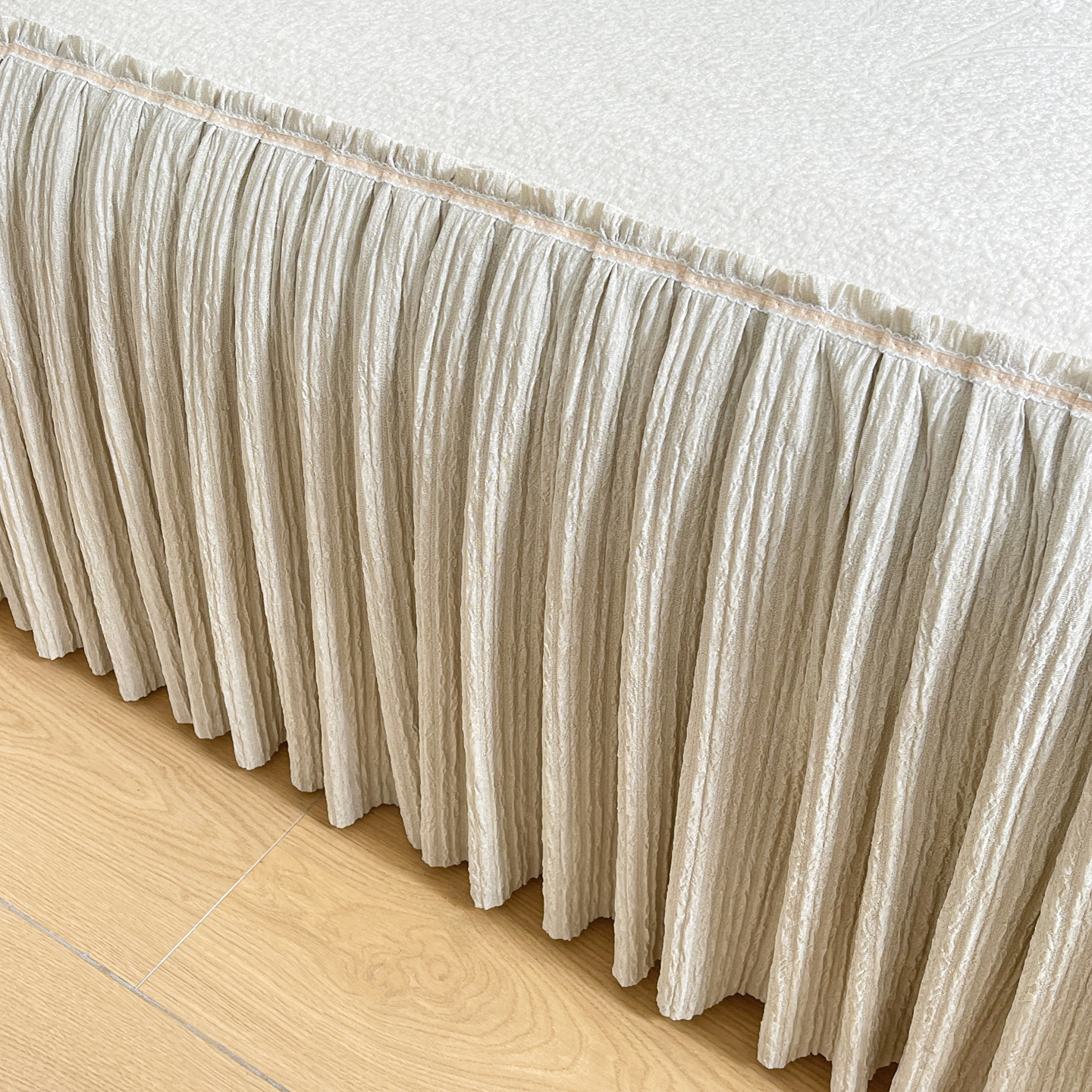 • 91家纺网 家纺一手货源 找家纺 牵梦萦家纺 2026新款立体浮雕压花工艺凉感豆豆凉席-床裙款 彩蝶-香槟