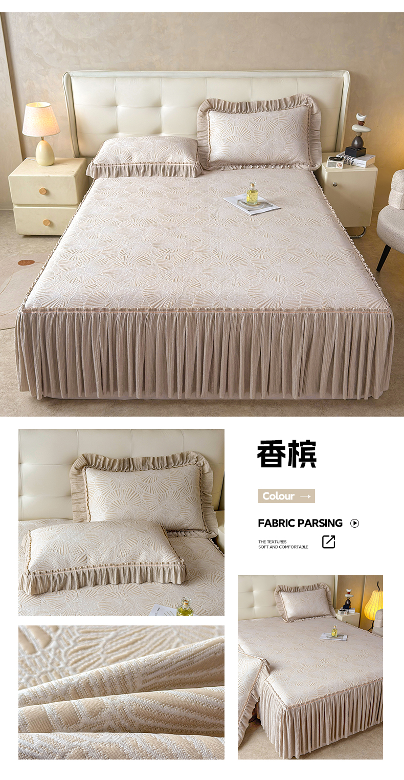 • 91家纺网 家纺一手货源 找家纺 牵梦萦家纺 2026新款立体浮雕压花工艺凉感豆豆凉席-床裙款 银杏叶-香槟