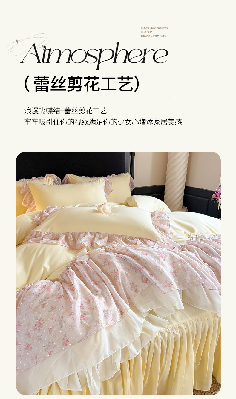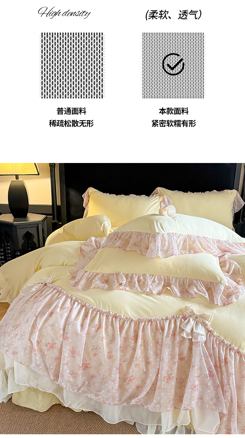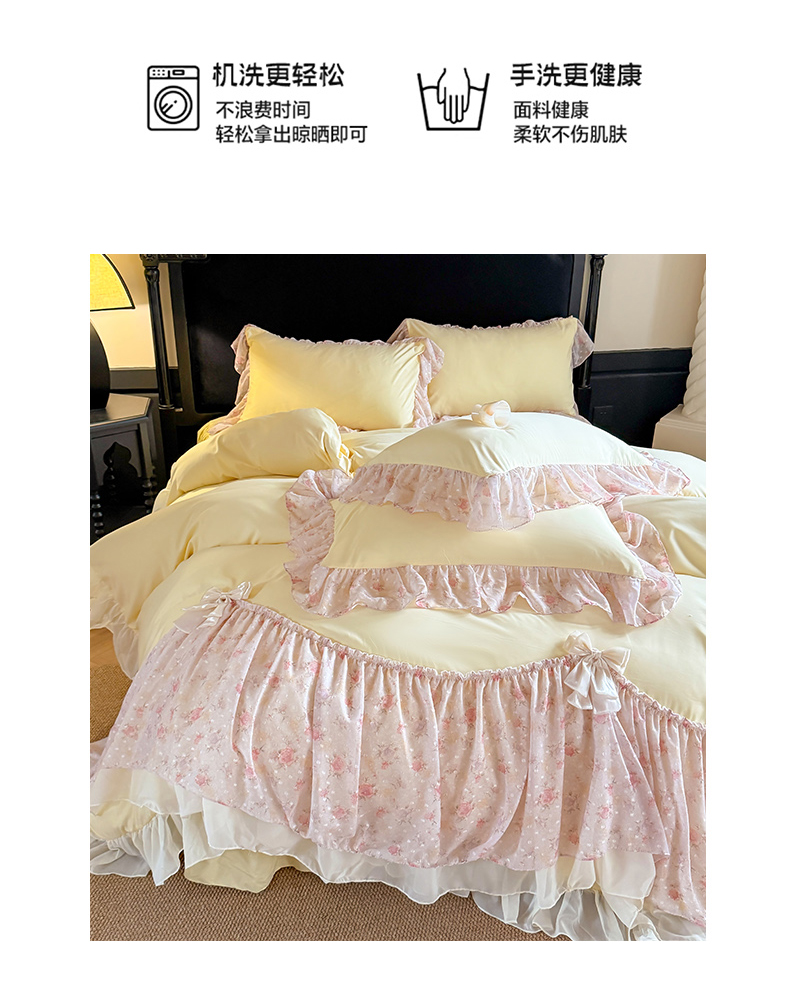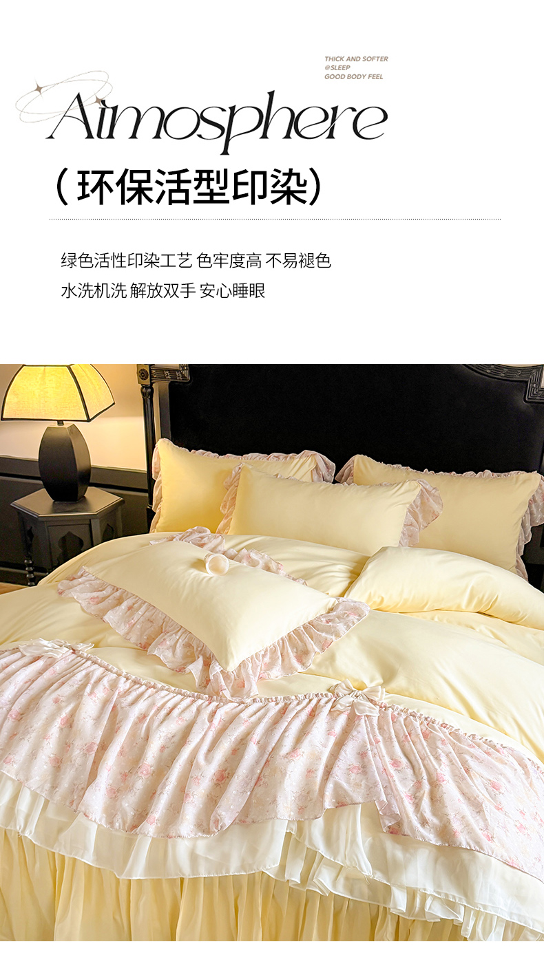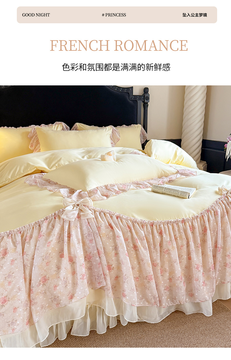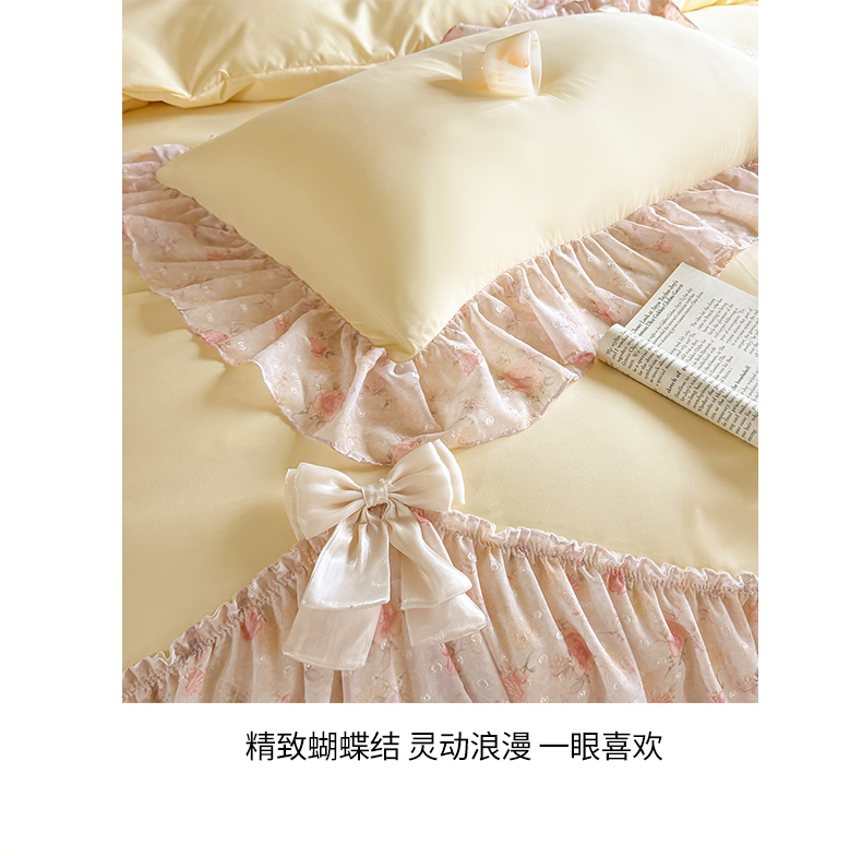 当前位置: 91家纺网 > 商品网购 > 床品套件 > 四件套 > 其它四件套 > 富盛家纺 2026新款水洗亲肤棉雪纺蕾丝刺绣法式床裙韩版四件套 浪漫主义-黄