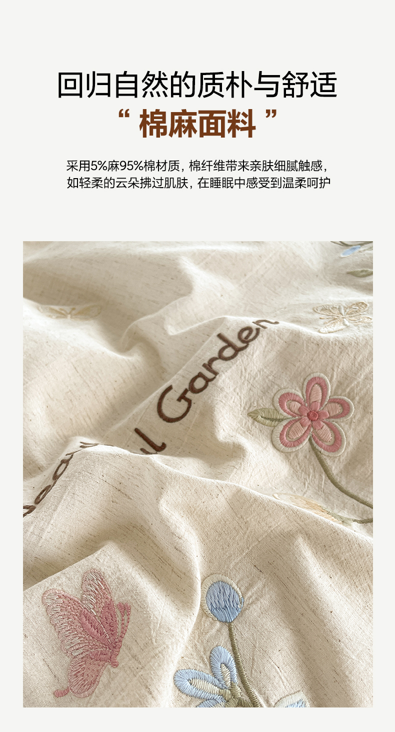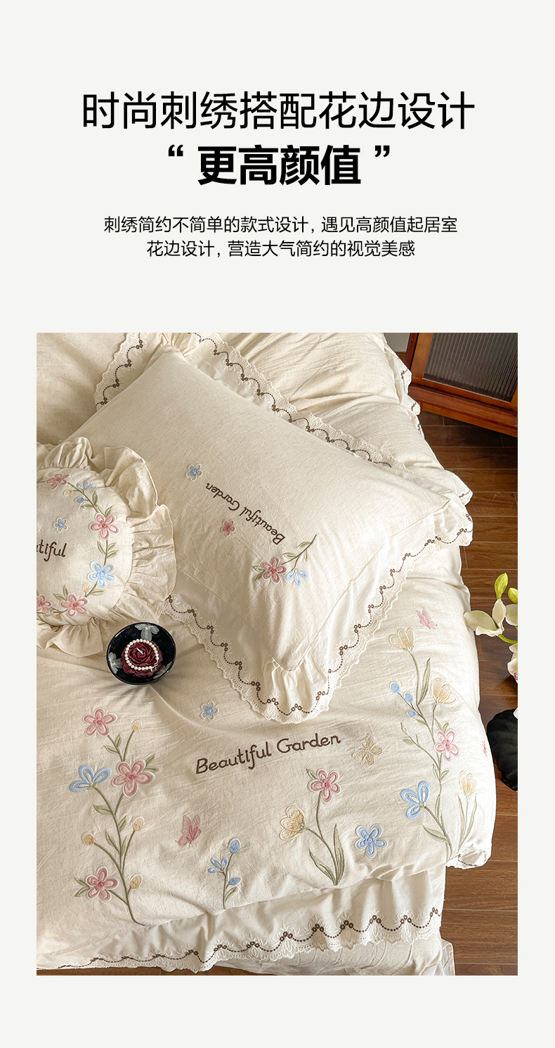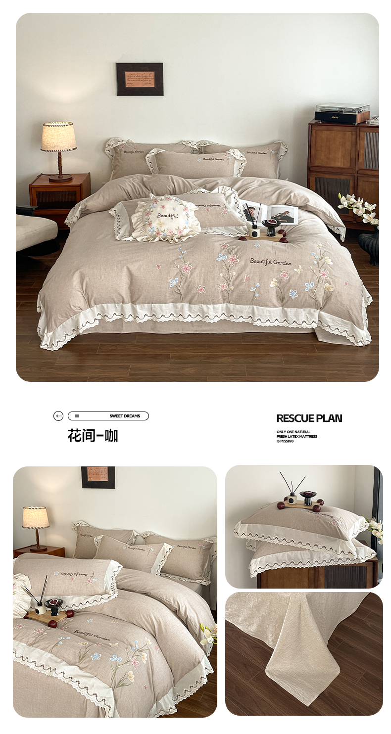 (总)如一 2026新款棉麻绣花花边款全棉亚麻四件套,花间-粉,花间-咖,花间-绿,花间-米