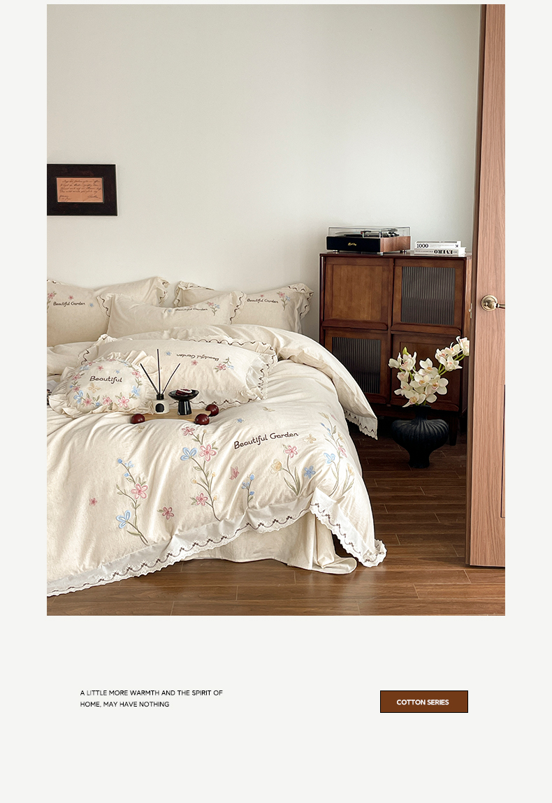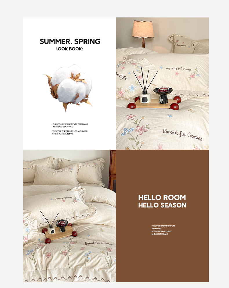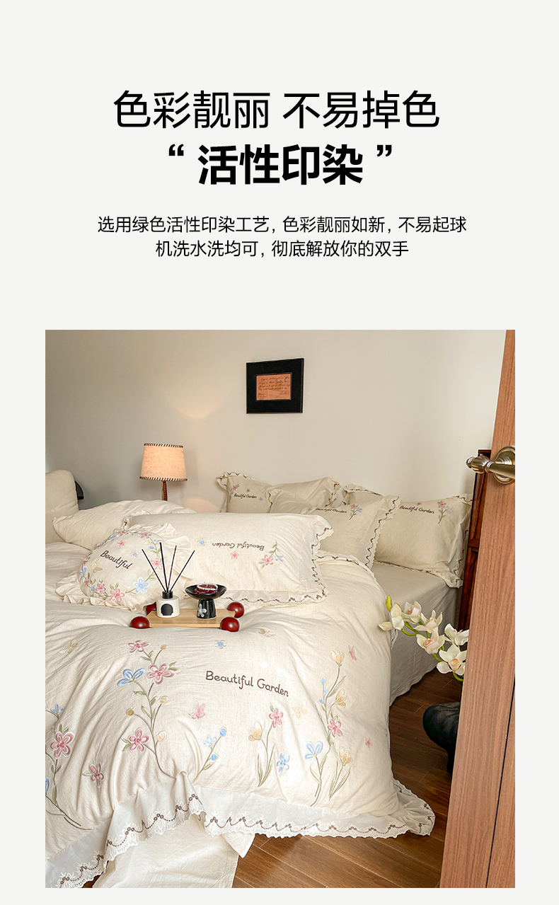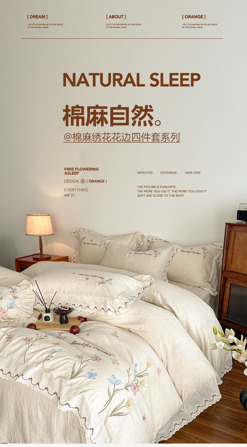 (总)如一 2026新款棉麻绣花花边款全棉亚麻四件套,花间-粉,花间-咖,花间-绿,花间-米