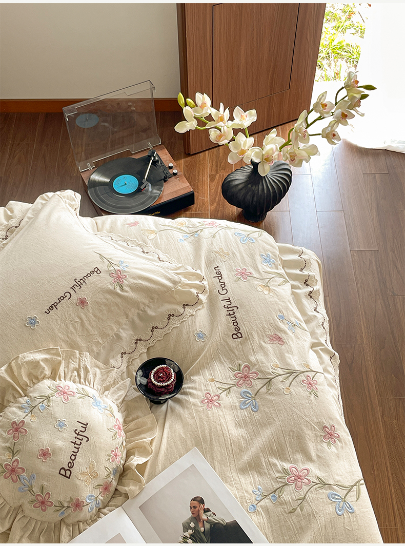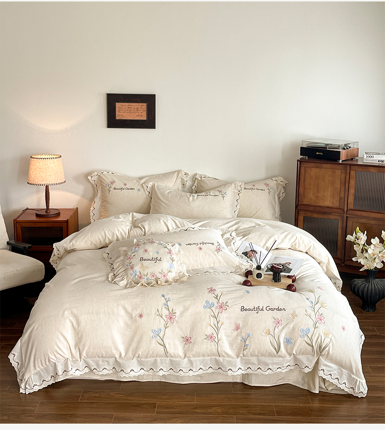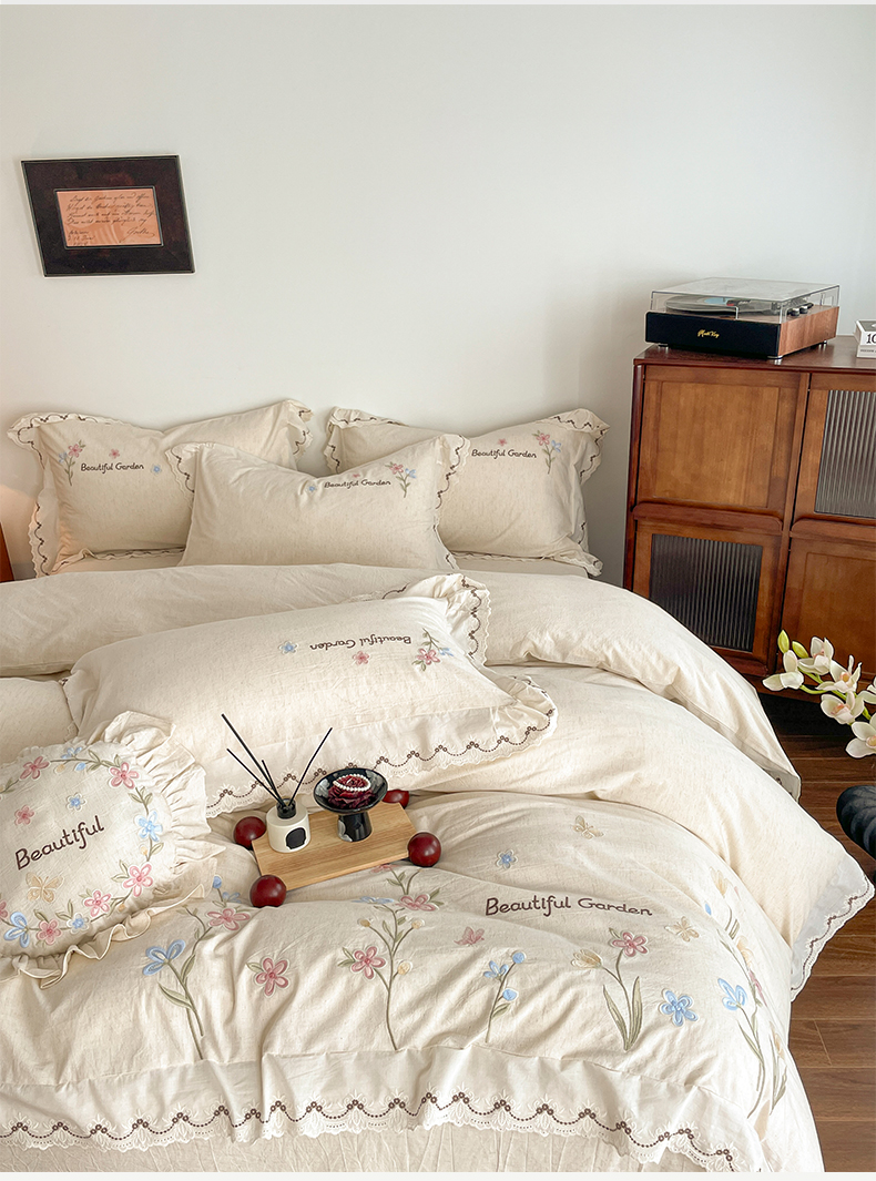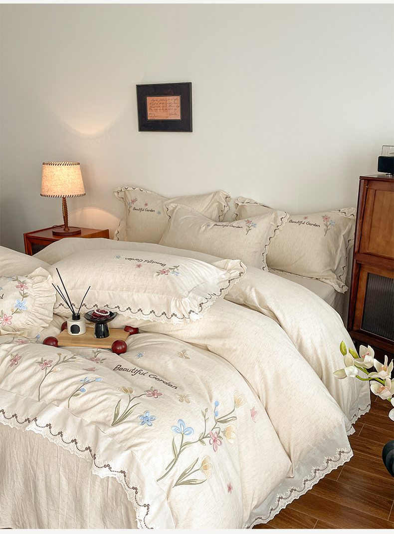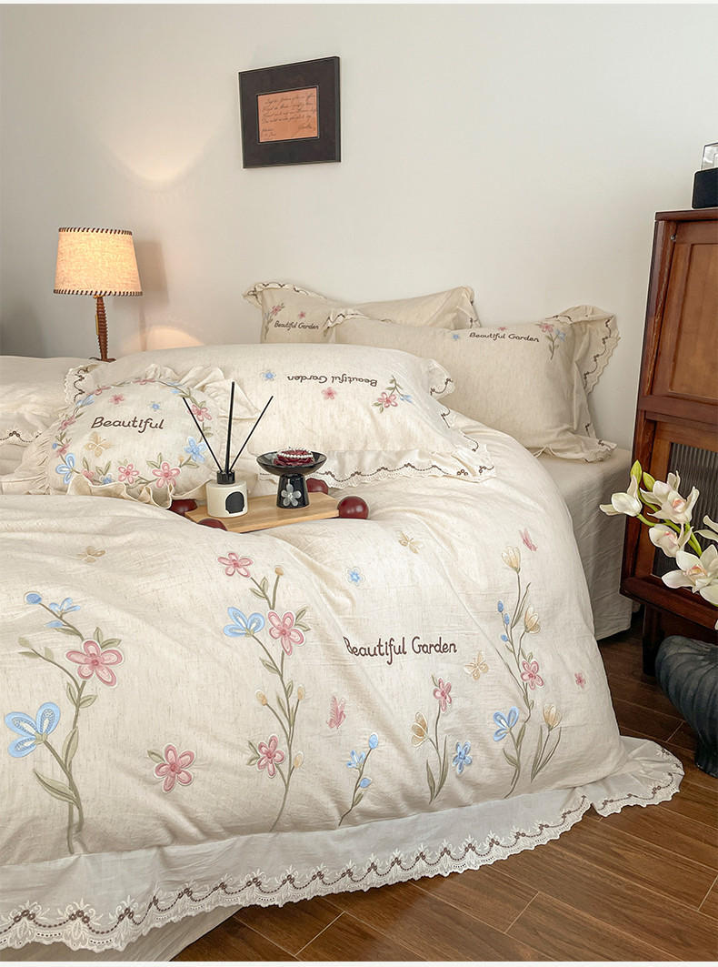 如一 2026新款棉麻绣花花边款全棉亚麻四件套 花间-米