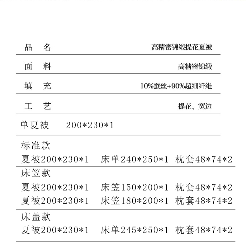 床盖款夏被200*230*1 床盖245*250*1 枕套48*74*2 | ¥118.00 |