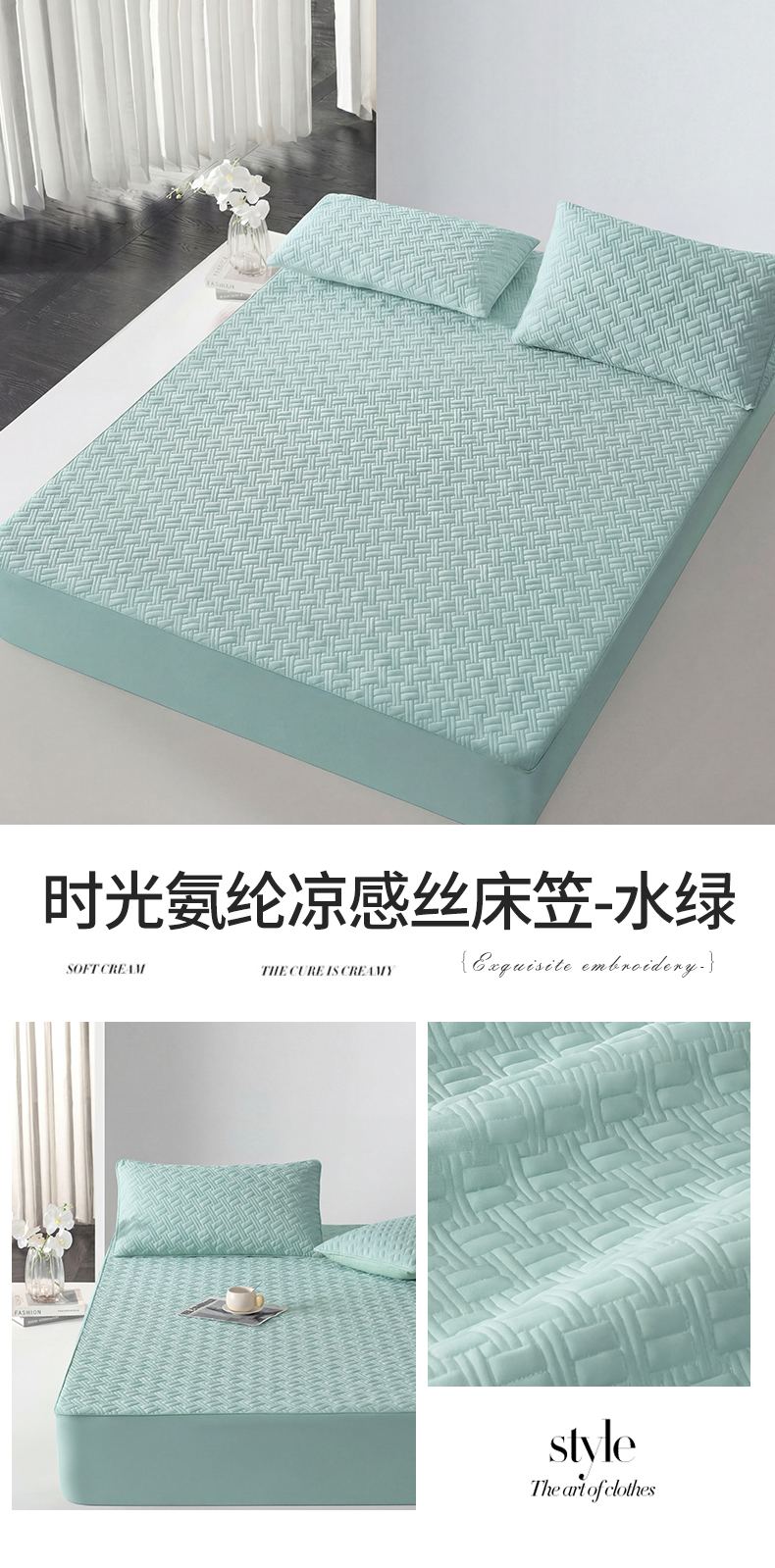 雯豆家纺 2026新款10A抗菌氨纶凉感丝夏季冰皮床笠三件套简约纯色床垫保护套-风格一 时光氨纶凉感丝床笠-水蓝