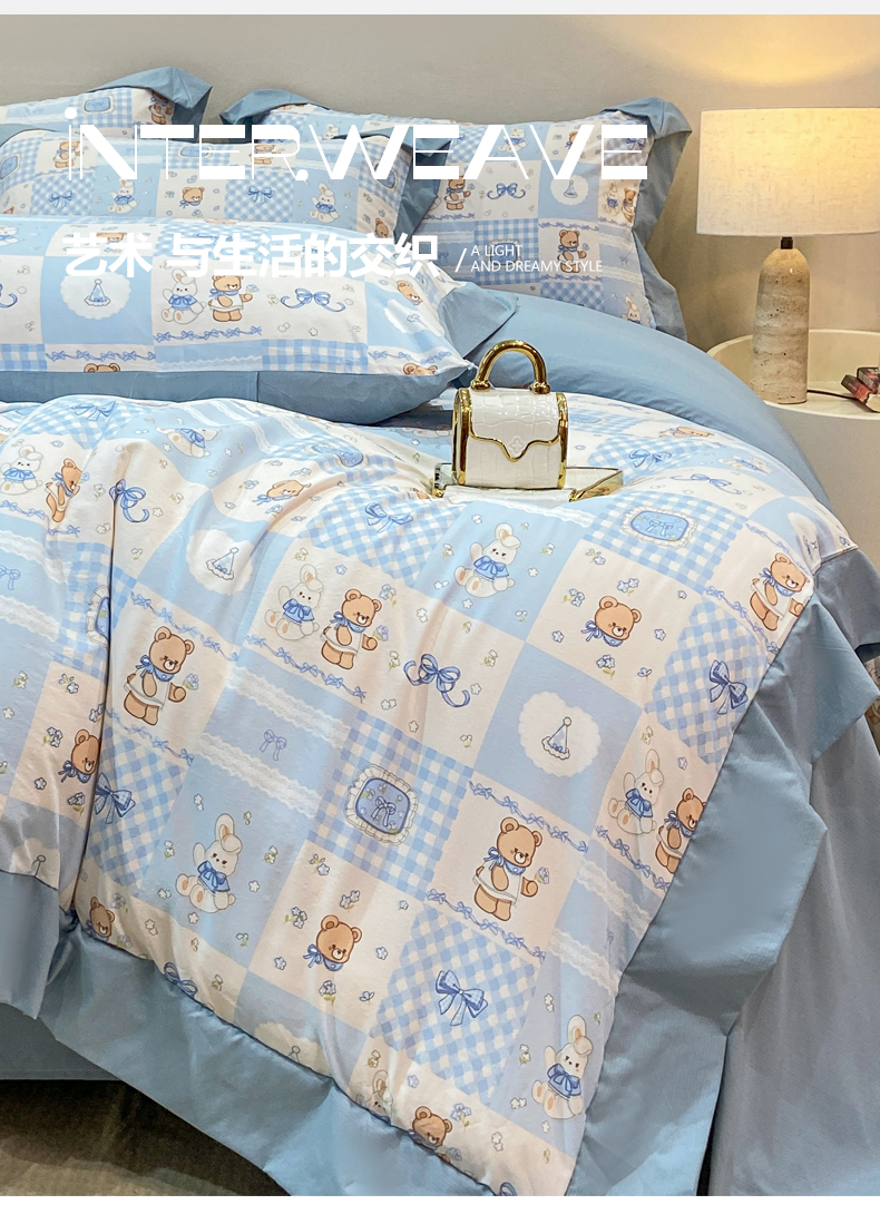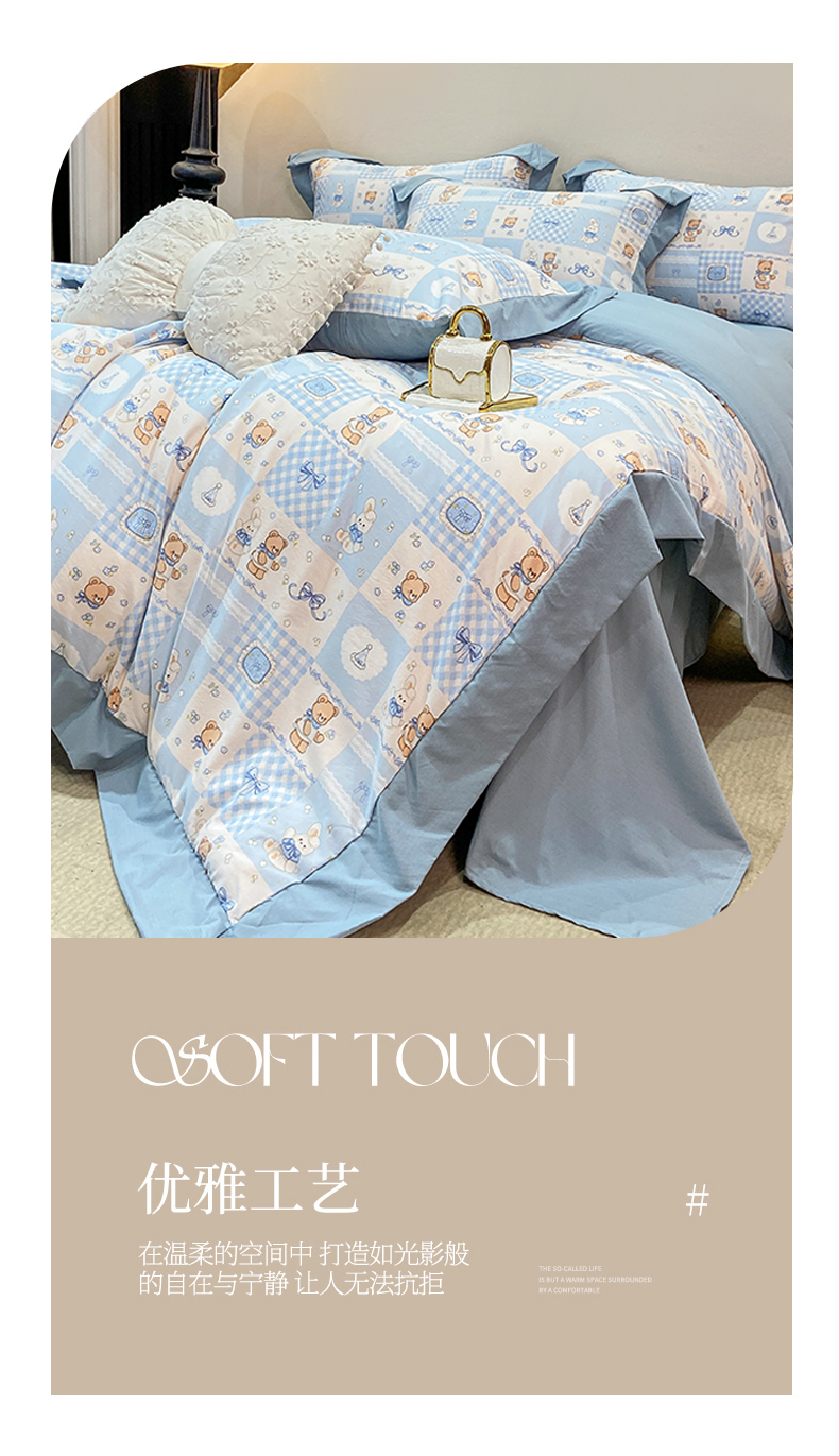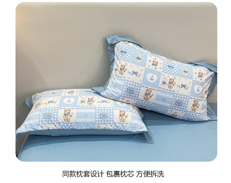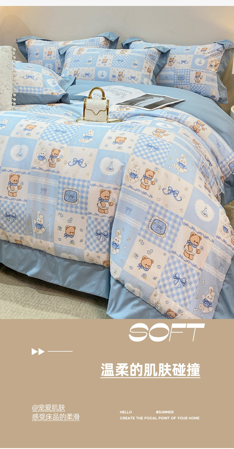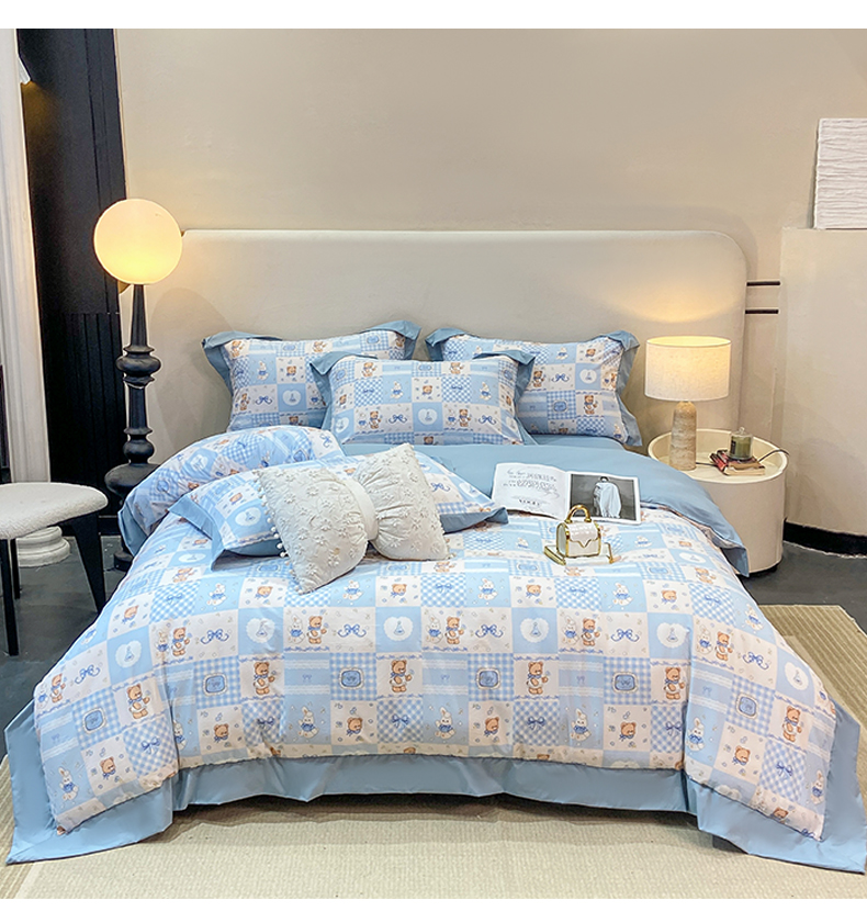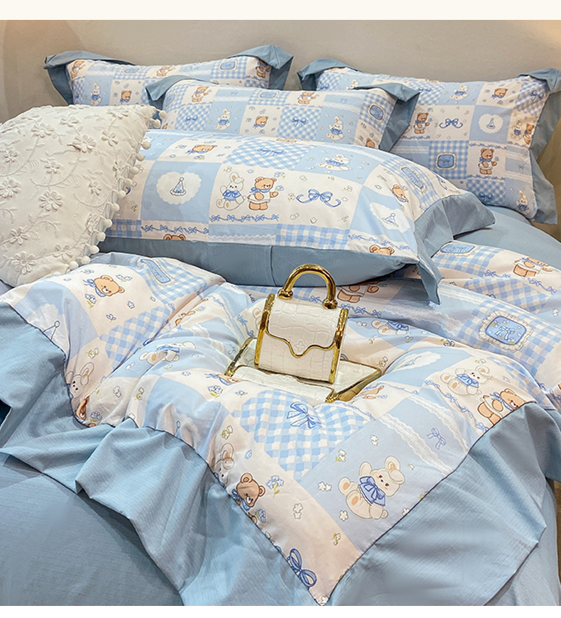 当前位置: 91家纺网 > 商品网购 > 床品套件 > 四件套 > 其它四件套 > 慕木家纺 2026新款A类印花拼角工艺慕斯棉四件套系列(抽空压缩可供跨境)提供买家秀 熊兔叙+蓝