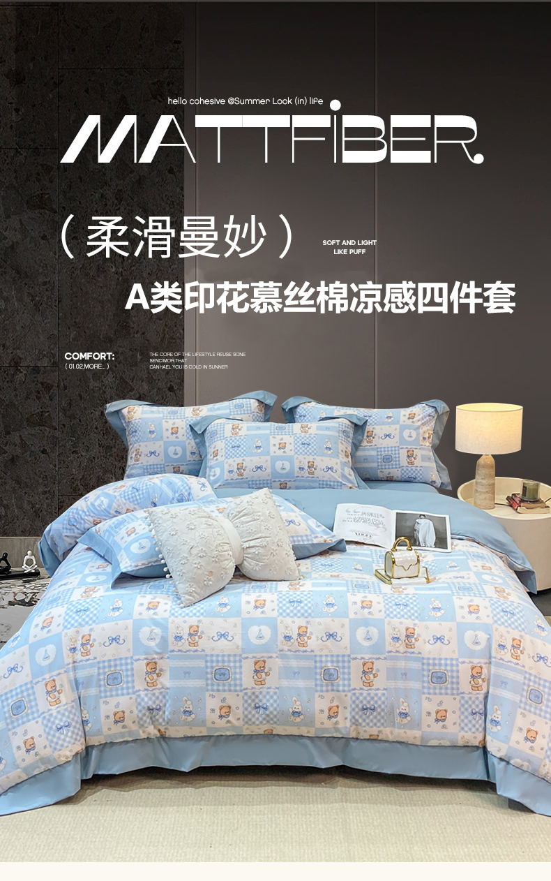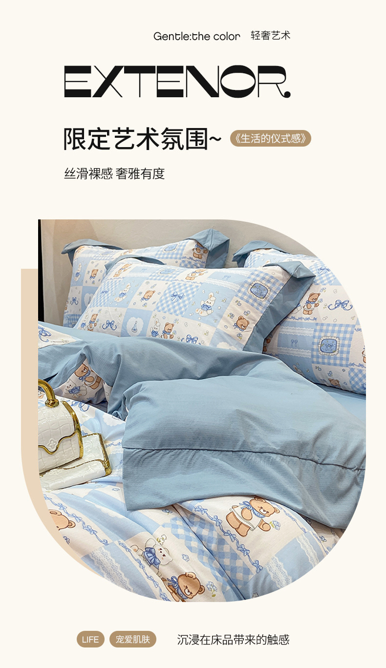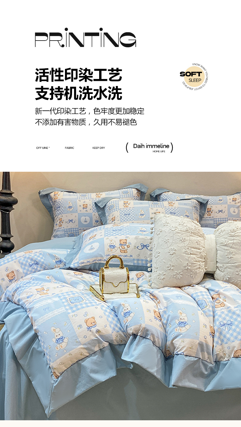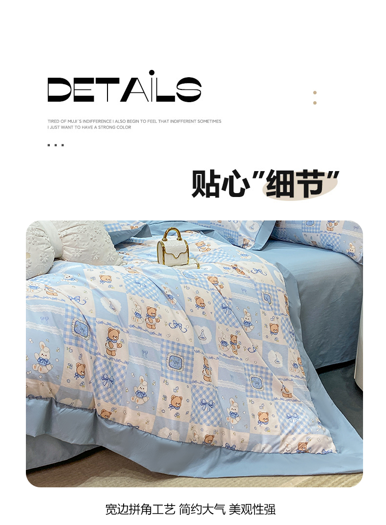 当前位置: 91家纺网 > 商品网购 > 床品套件 > 四件套 > 其它四件套 > 慕木家纺 2026新款A类印花拼角工艺慕斯棉四件套系列(抽空压缩可供跨境)提供买家秀 熊兔叙+蓝